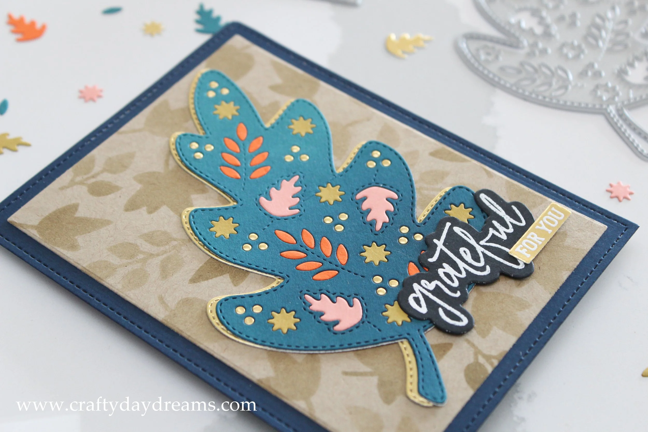 I heat embossed the ‘grateful’ on black cardstock using Alabaster embossing powder from Brutus Monroe, and embossed the ‘for you’ on the same matte gold cardstock using the same embossing powder. I like how the ‘for you’ pops against the ‘grateful’ and I like that it pulls it back to the gold on the leaf.