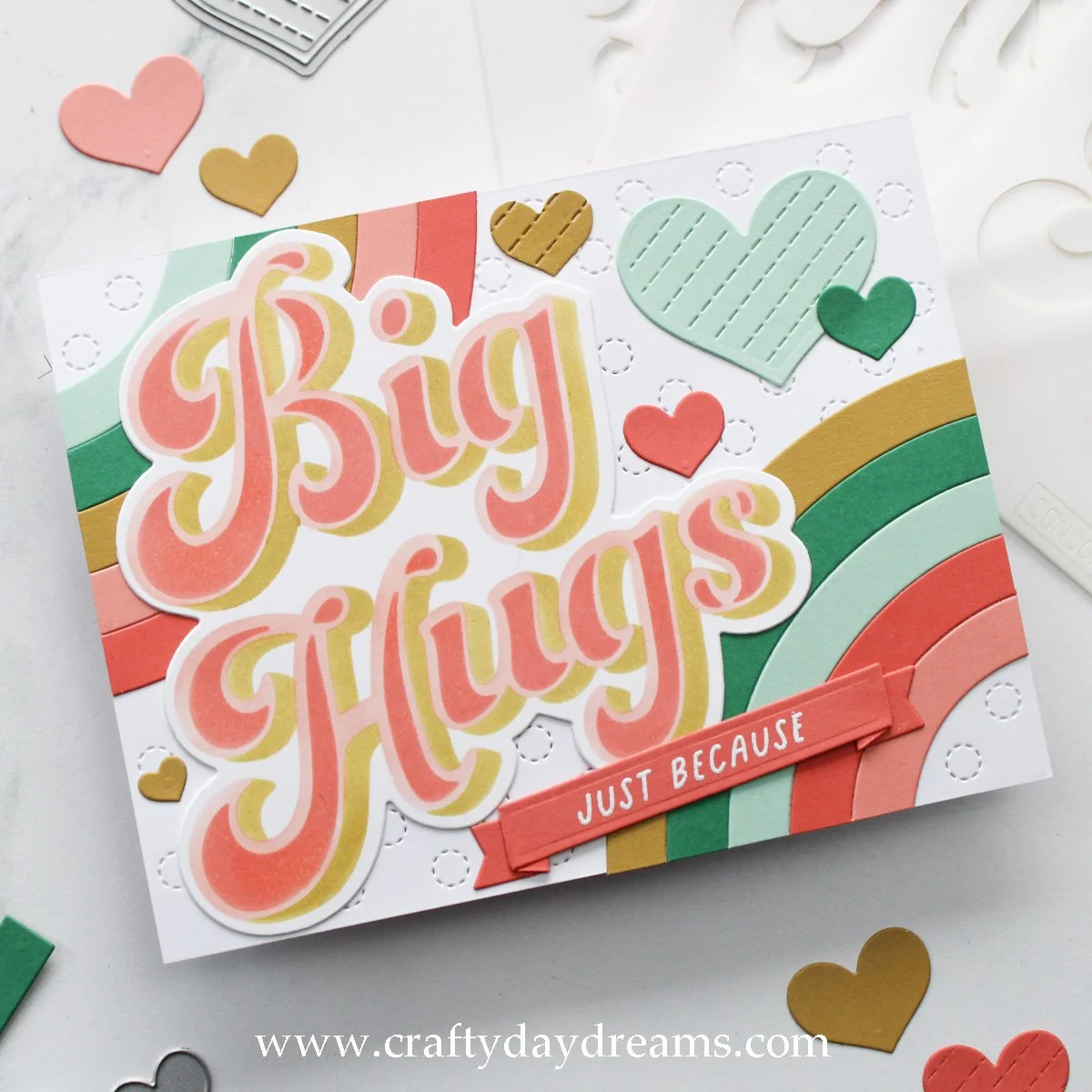 Today I’ve got a fun card for you featuring the Sending Hugs bundle from Concord & 9th’s February release. This bundle is super fun and includes a stencil pack, a die set with a coordinating die, some fun hearts and a banner die, and a small stamp set. I love the variety of sentiments in the stamp set—they cover every occasion!