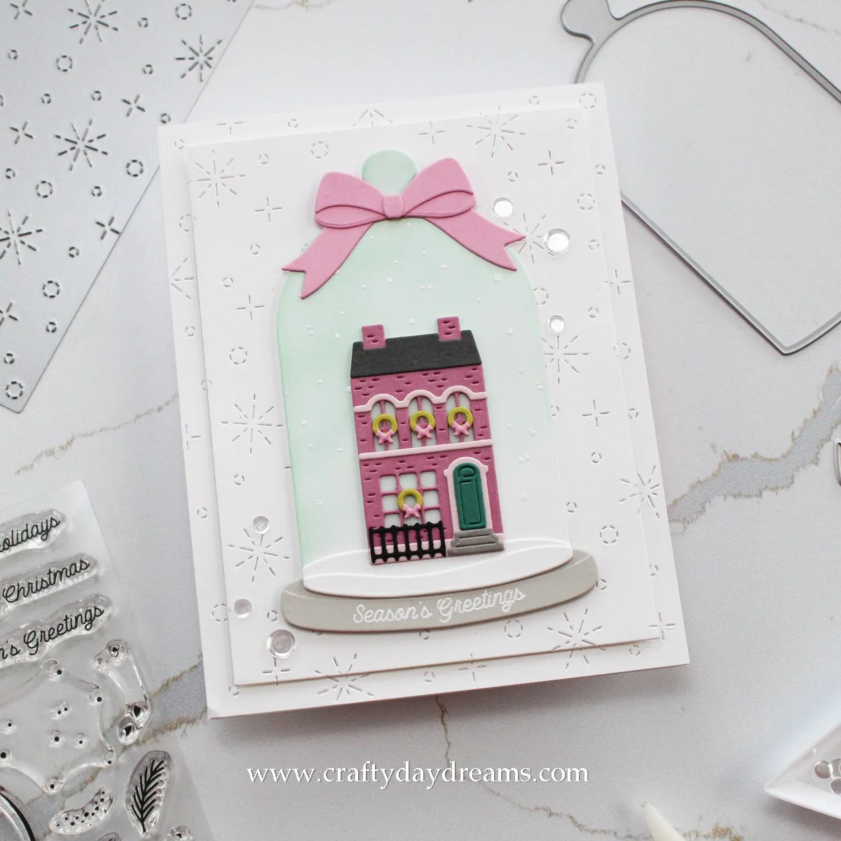 I loved one of the mock up/samples that C9 shared for this release that showed one of the houses from the Over the Rooftops die set inside the cloche, so I just had to give it a go! I decided to go with some colors I’ve been loving for some Sugar Plum Fairy vibes, and die cut the house out of Briar Rose, Ballet Slipper, Juniper, Mushroom, Lemongrass, Carnation (for the wreaths), black, and Cobblestone. I think this house is so super cute! I also added a layer of vellum behind the windows to give them a frosty look. To create a snowy scene, I die cut the larger cloche die out of C9 white cardstock, then white heat embossed some falling snow using the stamp in the Christmas Cloche stamp set. I pulled out Sea Glass ink and lightly blended it on the cloche, starting from the knob and feathering it out as I got closer to the ground. I love the soft look here!