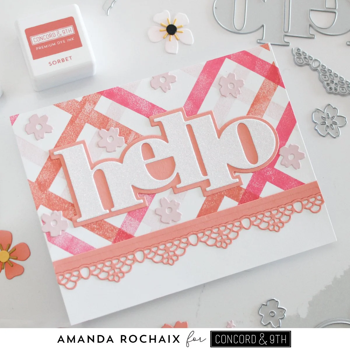 For the greeting, I die cut the shadow layer of the big ‘hello’ from the Everyday Sayings die set out of Grapefruit cardstock, and the words out of C9 white glitter paper. I absolutely love this glitter paper, it’s my favorite of any I’ve used, and I wholeheartedly recommend that every crafter should have some! Once the greeting was glued down, I used the smaller floral die from the In the Meadow die set and die cut it out of Ballet Slipper cardstock and glued them around the ‘hello’.