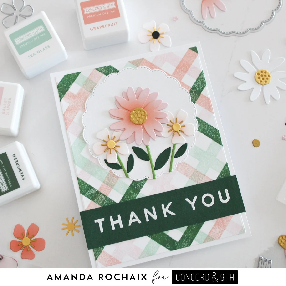 I used two floral dies and the stems and leaves dies from the Petal Pushers die set and created a little floral scene to go on top of the scalloped circle. I die cut the largest flower out of Ballet Slipper cardstock and blended Grapefruit ink on the center of the flower to add some definition. I die cut the flower centers for all the flowers out of Stardust and Buttercup cardstocks. The smaller flowers were die cut out of C9 white cardstock with Ballet Slipper ink blended on them, the stems were cut out of Parsley cardstock, and the leaves out of Evergreen. Lastly, I finished the card off with a chunky sentiment that spanned the whole card. I white heat embossed the ‘thank you’ from the Petal Pushers stamp set on Evergreen cardstock and glued it down.