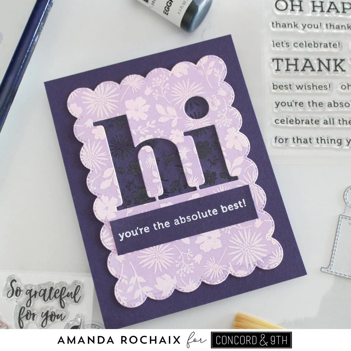 I die cut my watercolored panel with the scalloped rectangle from the Simply You die set. I used the medium sized ‘hi’ from the Everyday Sayings die set and I cut it out of the middle of the panel. I matched up the pattern on the clear heat embossed Eggplant panel with the pattern of the light purple panel so there would be a double punch of florals on this card. Once I had the scalloped panel glued to the Eggplant card front, I went to work on a sub greeting. I stamped and white heat embossed ‘you’re the absolute best!’ from the Happy Thanks stamp set on Eggplant cardstock.