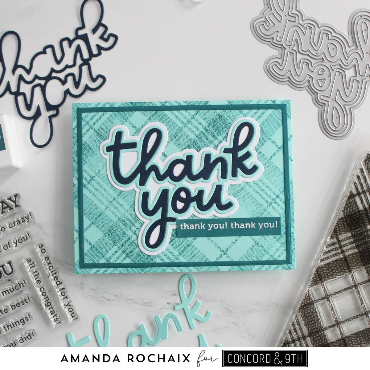 This last card is clean, simple, and sorta leans a little masculine (though it definitely can be for anyone who loves the color blue and plaid!). I started this card off by using the Woven Plaid background stamp and stamping it with Peacock ink on an Aqua Sky card front. This turned out so so pretty, I love it! I’ve really been getting into plaids lately, and this is no exception. The texture on it is so fun and makes it feel so cozy. After not knowing if I wanted to cut the panel down and pop it on a white card base, I decided to make a Peacock frame with two nesting rectangle dies in order to really punch up that Peacock color. For the sentiment, I die cut the shadow die of the ‘thank you’ out of plain white cardstock. I die cut the words out of Midnight and Aqua Sky, used the Aqua Sky as the outline and the Midnight for the words. With the exception of white, I went pretty monochromatic with this card. To finish it off, I white heat embossed a sub sentiment on Peacock cardstock and glued it off to the side. To be honest, I’m not so sure how I feel about this card since to me it feels a little lackluster (I thought about adding enamel dots, but hadn’t at the time), but at the same time it’s a little different from my usual style so maybe that’s okay.