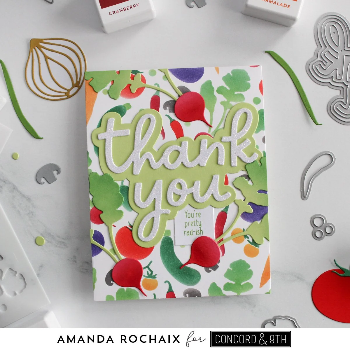 To finish the card off, I added some die cut radishes to really drive the sentiment home. I die cut the radish out of Honeysuckle cardstock and added some Cranberry ink to it for some extra depth and dimension. The leaves were die cut out of Sprout cardstock and I added Evergreen ink to the leafy portion for dimension as well. I assembled the veggies and glued them on.