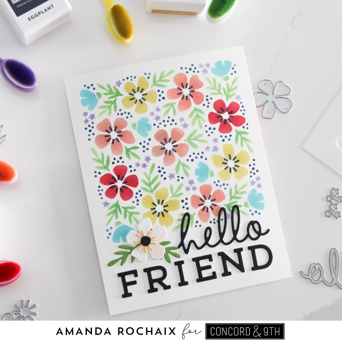 For the sentiment, I die cut the ‘hello’ and ‘friend’ die included in the die set out of black cardstock and once out of white to add some dimension. Once I had the sentiment glued down, I decided to add a floral die cut that I had from last week to the card. I die cut the greenery pieces out of Parsley cardstock, and the flower was die cut out of Ballet Slipper, Buttercup and black. I love how sweet the flower looks next to the sentiment and how it ties into the stenciling.