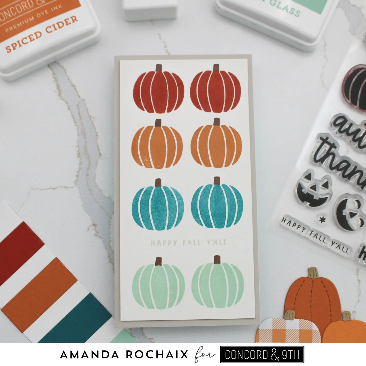 When I tell you this color palette gives my fall girl heart the warm fuzzies, I mean it. It is fall perfection with some pops of blue: Sea Glass, Peacock, Spiced Cider, and Cayenne—so good! To make this card a bit more brainless, I used my Sea Glass panel as a template. I lined up my 6 x 3-inch piece of white cardstock in the corner of my MISTI, then lined my Sea Glass panel up on top of it. This made lining up my stamp a breeze, and then the only variable that I had to be cautious/careful about was my second pumpkin on each row. Once my Sea Glass pumpkins were stamped, I added the pumpkin tops in Nutmeg, then stamped my greeting in Pebble ink.