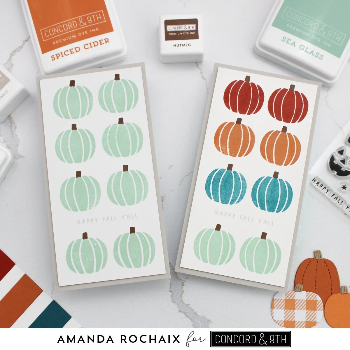I started off by cutting a panel of white cardstock to 6 x 3-inches, popped it in my MISTI, then lined up the smallest pumpkin stamp in the lower left corner of the paper. I stamped the pumpkin in Sea Glass, then shifted the paper to the left in my MISTI and eyeballed placement for the second pumpkin in the row, trying to keep the same spacing on both sides. Once I got the two pumpkins stamped, I was pretty happy, so I stamped the pumpkin tops with Nutmeg ink. Before stamping my next row of Sea Glass pumpkins, I stamped the ‘happy fall y’all’ greeting in Pebble ink. From here, I repeated the my pumpkin stamping until the panel was full. To be honest, I was so incredibly lucky this panel turned out the way it did haha! I literally didn’t measure anything and wasn’t even sure how many pumpkins I would fit on the card front. Since I loved the Sea Glass panel so much, I had to make another version, especially since these cards come together SO quick.