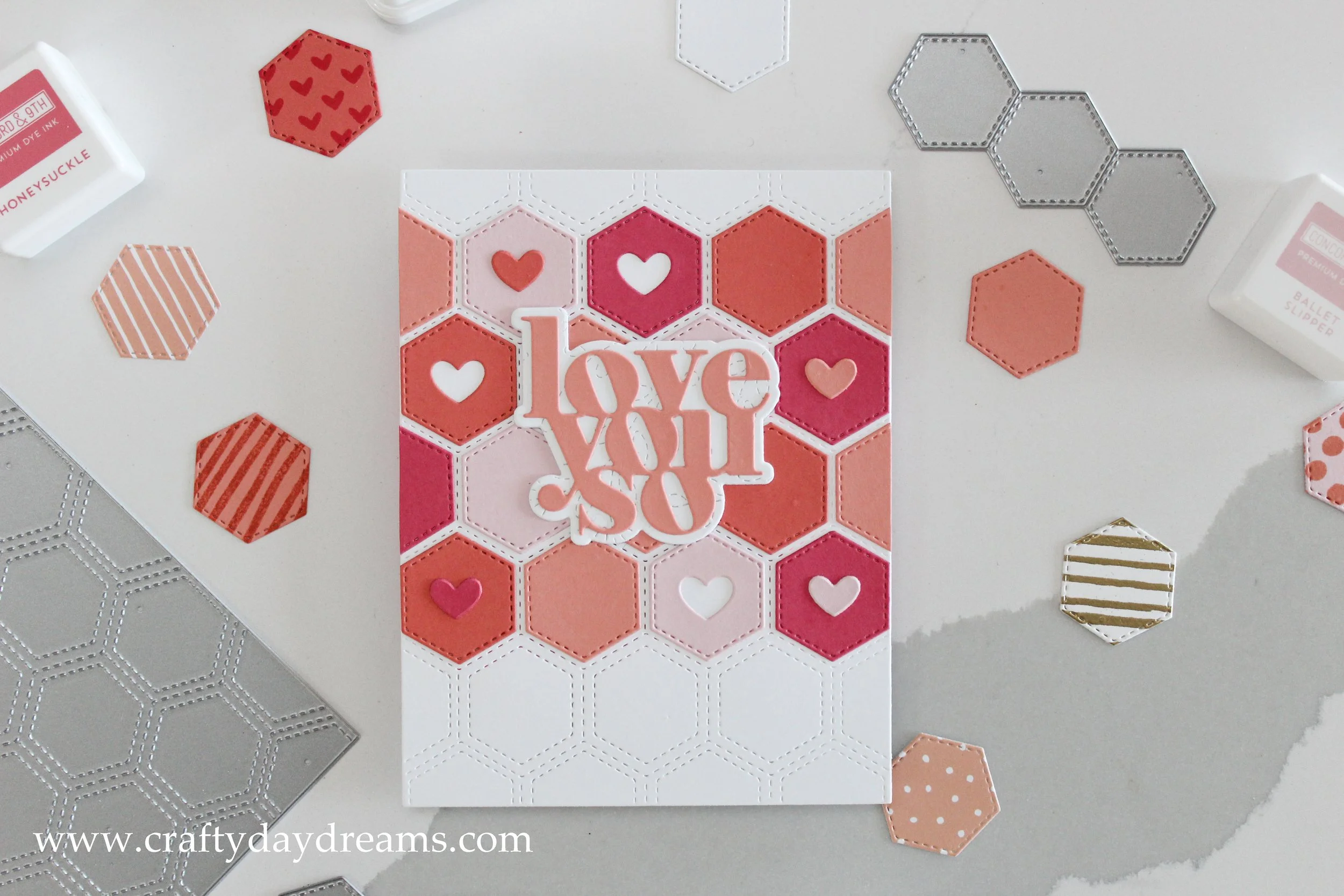 I pulled the ‘love you so’ sentiment from my stash, which was die cut from Grapefruit for the words, and the shadow layer out of a white panel die cut with the Stitched Vines card front. I like that this brings a subtle stitched aspect to the greeting to tie it into the background. I finished the card off by taking the extra hearts from the heart cut out hexagons and placed them randomly. I really like how this card turned out, and how clean and simple it is!