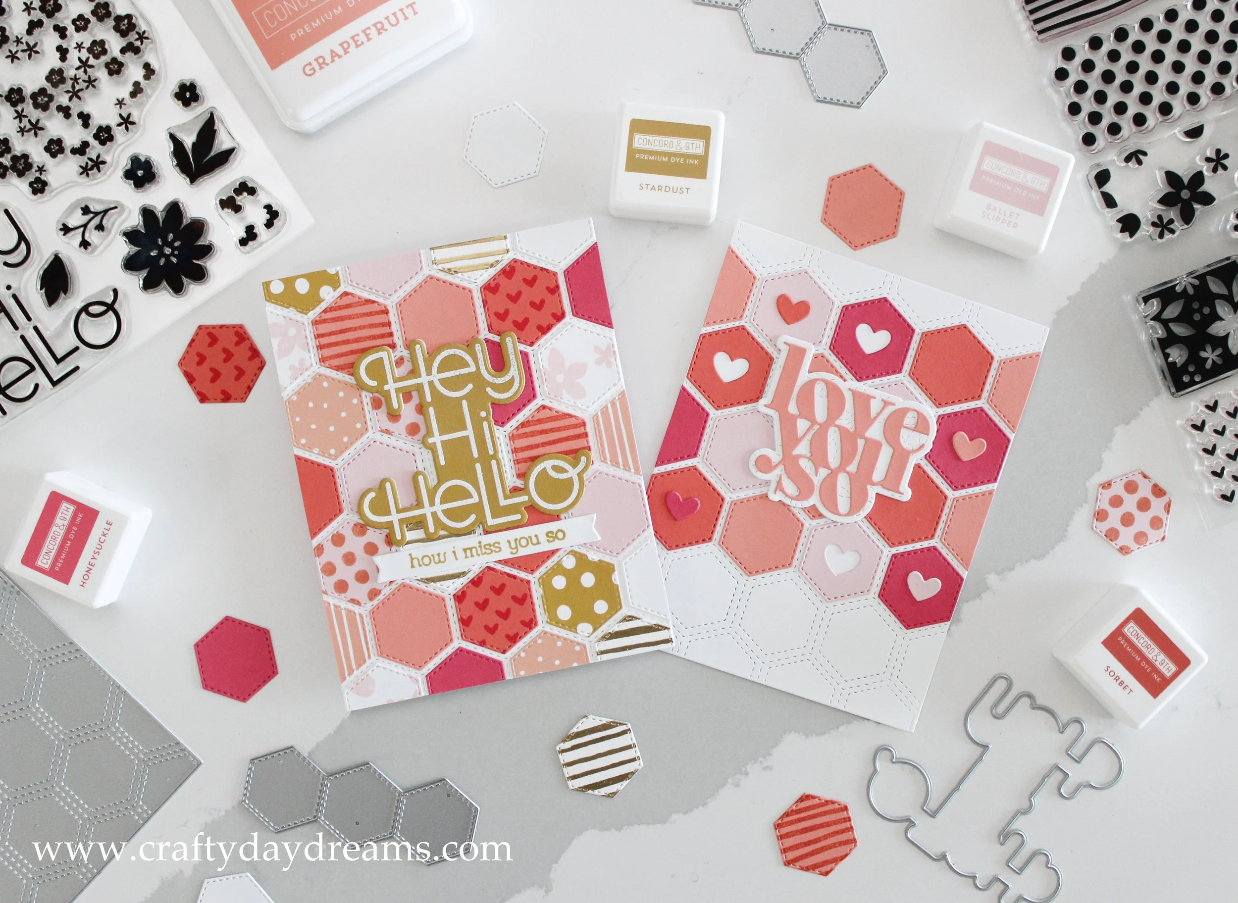 I’m wrapping this week up with these sweet cards I created using the new Honeycomb Quilt Top die from Concord & 9th. And let’s face it, this is probably the closest I’ll ever get to quilting, but I think I had just as much fun. I really enjoyed creating with this die set and how versatile it is. It’s great as a plain textured background, but also lots of fun to die cut hexagons out of a variety of colors and patterns to make your own patterned card front. Scroll on down to see how I made each of these cards!