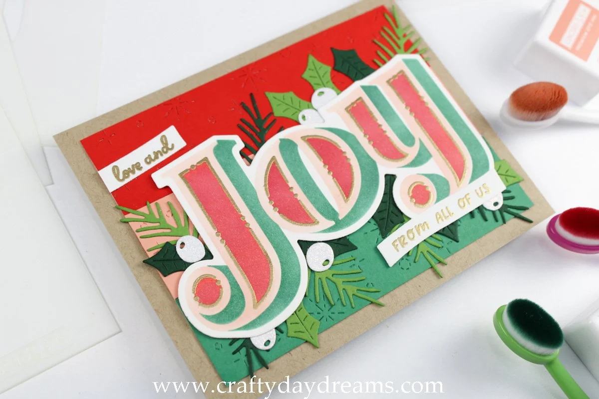 I started this card out by ink blending with the Holiday Joy Stencil Pack. The front side of the letters were ink blended in Grapefruit, the inner detail was blended in Cranberry, and the shadow on the word was blended in Evergreen ink. I love these three colors together, especially what Grapefruit adds to the traditional Christmas colors. Once I was done blending, I die cut the ‘joy’ with the coordinating die and got ready to stamp the inner details on the Cranberry section. This took a bit of practice to line up, so I would highly suggest lining it up and checking your alignment by stamping on acetate or extra stamp packaging. This saved me from having to restart!