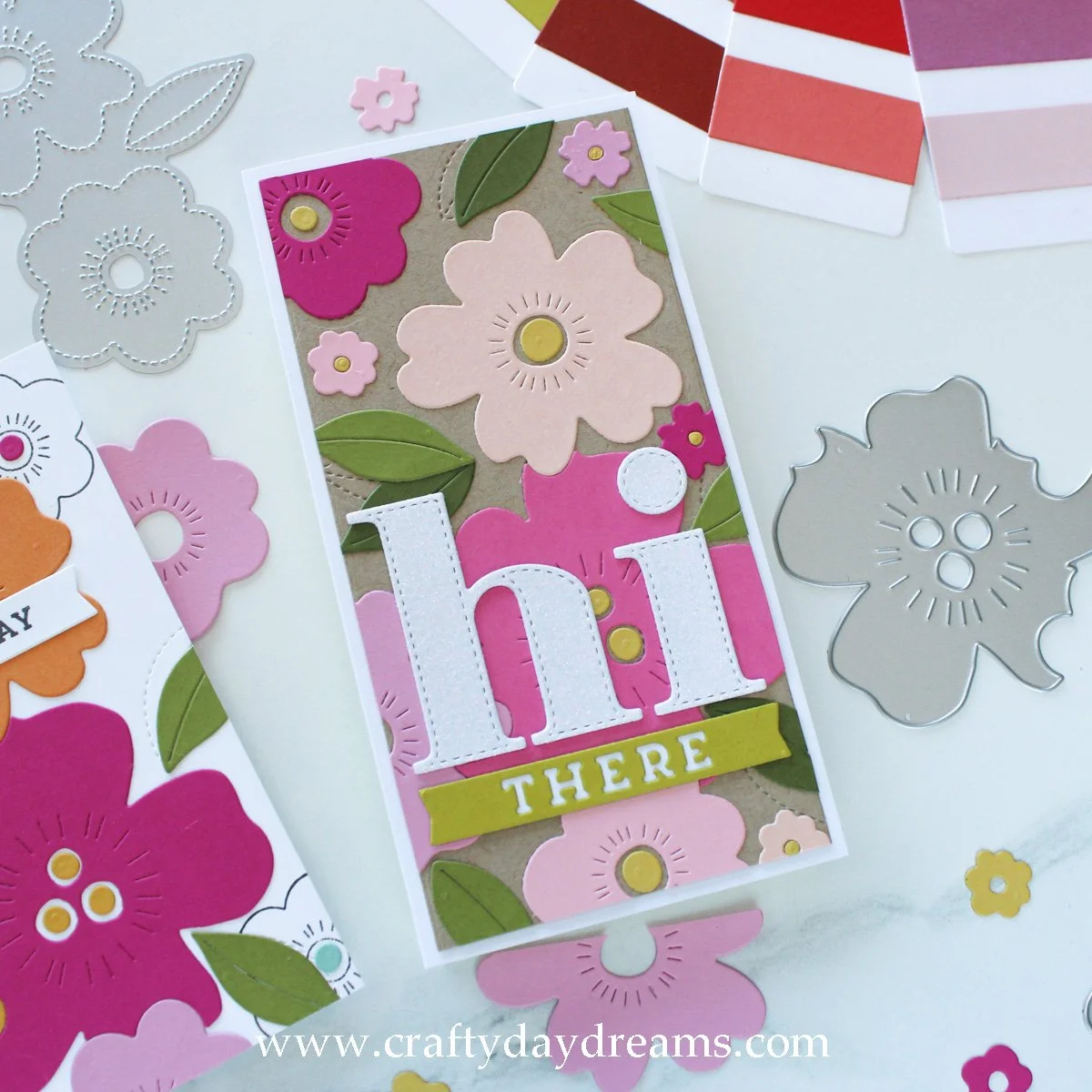 I had so much fun playing around and making this card! While watching the class on Saturday, I had the idea to use this die set on wheat cardstock and to see if I could make a slimline or mini slimline with it. I die cut flowers out of (starting from the top to bottom): Dragonfruit, Nectar, Sweet Pea, Carnation and Pink Lemonade. The tiny flowers were cut out of those same colors and spread around, the flower centers were die cut out of Honeycomb, and the leaves were die cut out of Avocado and Artichoke cardstock. I love these olive-y greens and can’t wait to buy a pack of them! Originally I was thinking of making this a Mother’s Day card, but I didn’t have a sentiment that I thought would fit the size of this card well. So, I pivoted and decided to use the stitched ‘hi’ from the Everyday Sayings die set as well as the sub-sentiment ‘there’ from the same die set. I die cut the ‘hi’ out of C9 white glitter paper, and the ‘there’ out of a new cardstock color—Lemongrass. I love how all these colors play so well together on this card!