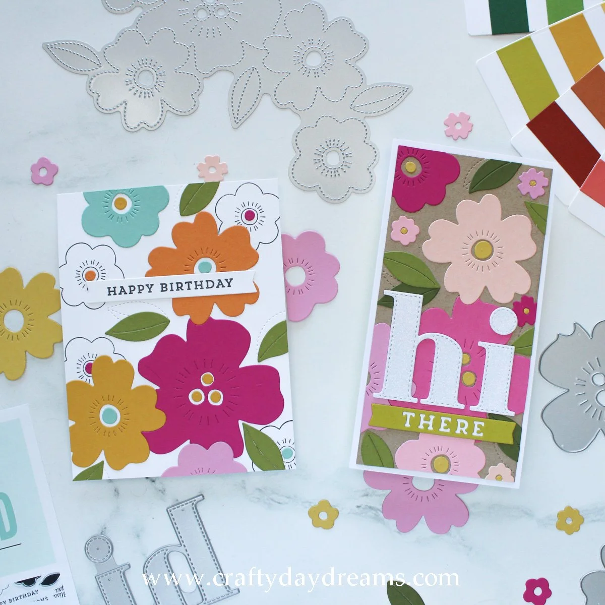This post only features one of the class sets, Big & Bold, which was taught by Laura Bassen. The other, Pretty Petals taught by Cathy Zielske, has a great stamp heavy bundle that I haven’t had the time to get to yet, but I will soon! But back to Big & Bold, I love this product suite— the floral stitching die alone gives me life 😍. This set comes with a large floral stitching die, florals to layer on top of it, and some really great leaves/stems and teeny tiny filler florals. Today’s blog post shows off only one of the four cards made in Laura’s class and one that I came up with myself. I can’t wait to play with all of the product more, but I only have these two to share today since I wanted to get a blog post up today.