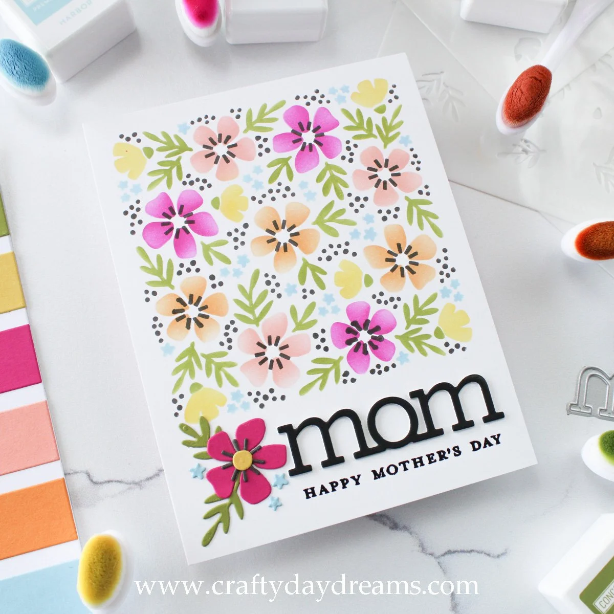 Today I’m back with another floral Mother’s Day card! After the new Concord & 9th ink and cardstock colors came out, I couldn’t wait to use them with their previously released stencils, and today I’m using the Petal Pushers stencil pack! Since I really liked the color palette I used on my last card, I thought it was perfect to use with the four-step floral background stencil. I also decided to go back to a design I created when I was guest designing with this product because I really liked it, and it allowed me to whip this card up super quickly, which I loved since I was behind on sending out our Mother’s Day cards.
