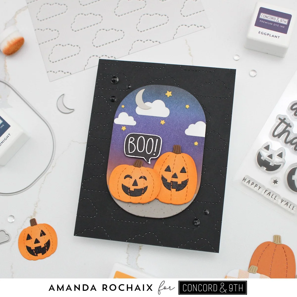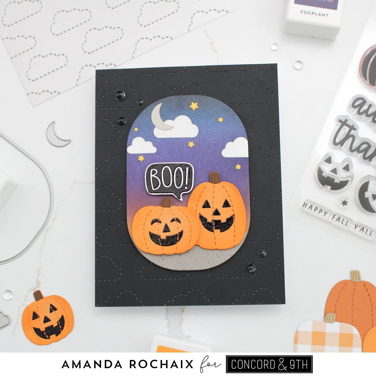 With things ready to go, I started assembling my scene. All the sky elements were glued down, and the tall pumpkin adhered with thin foam squares while the short one was stuck down with thick foam squares. I black heat embossed the ‘boo!’ sentiment, die cut it with the coordinating die, and popped it up on some thick foam squares. Isn’t this so cute?!