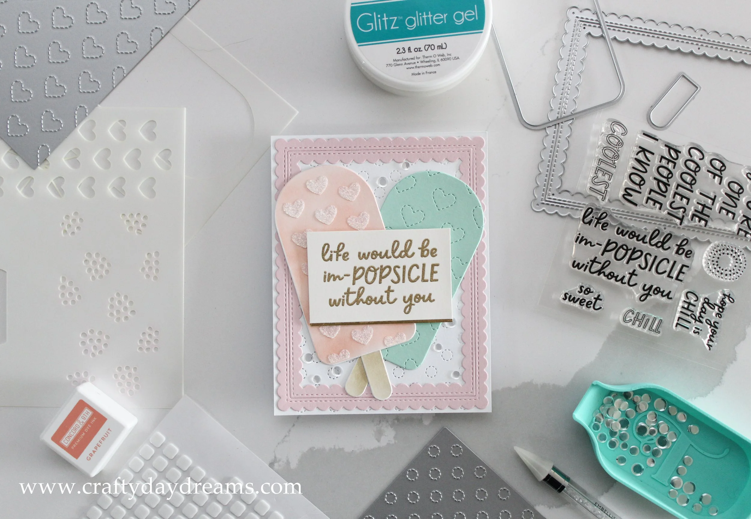To start this card off, I ink blended a popsicle using Grapefruit ink. Then I lined up the corresponding heart stencil and applied Iridescent Glitz glitter gel and set it aside to dry. Once it was dry, I die cut it and inked and die cut a stick out of Wheat ink. I wanted this card to feel fun, so I die cut a white panel using the Stitched Polka Dot card front die and moved on to my second popsicle. I had orignally wanted to use the Honeysuckle popsicle I had left over from my first card, but in the end I felt like it was too much of a highlighter color in comparison to the softness of the Grapefruit popsicle. While showering, I had the best shower thought haha, and decided I would use the Stitched Hearts card front to cut out a popsicle, that way it would tie into the Grapefruit one, as well as the sentiment I was planning to use. So I did just that using some Sea Glass cardstock, and inked and die cut another popsicle stick.