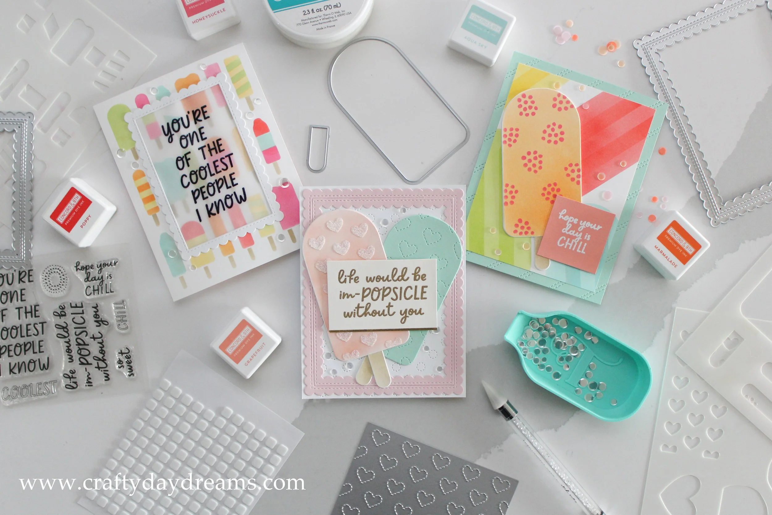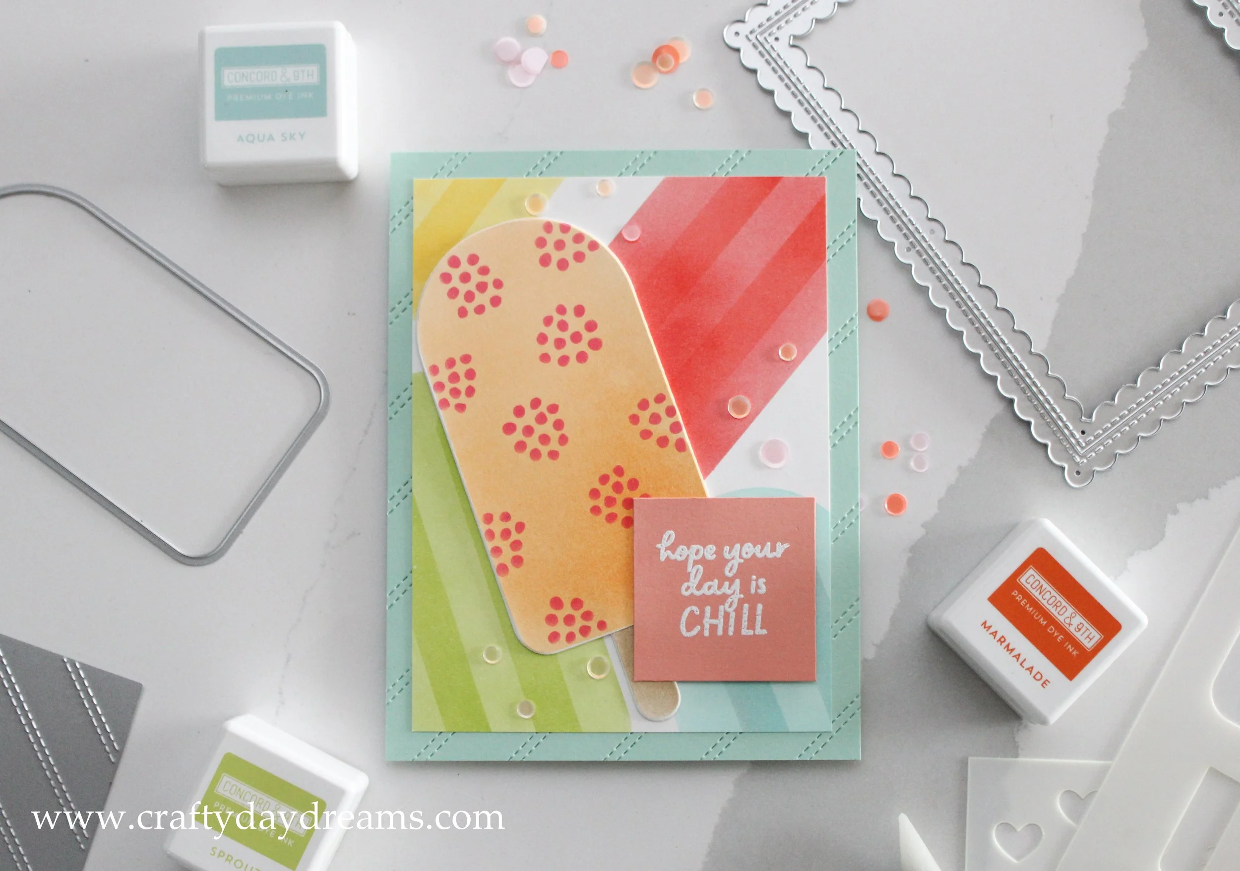 I’m back with a set of fun and easy popsicle themed cards using the Popsicle Party stencils and Sweet Summer bundle from the July release from Concord & 9th. These stencils are so fun to use, and I love the variety of popsicles you can make with them! They are perfect for summer months, but I don’t think I would be upset if I received a card like this in the winter, they’re so cute! As always, my tip when it comes to ink blending is to use Concord & 9th white cardstock, this stuff allows your inks to blend like butter! But if you don’t have that on hand, any other good quality smooth white cardstock would work.