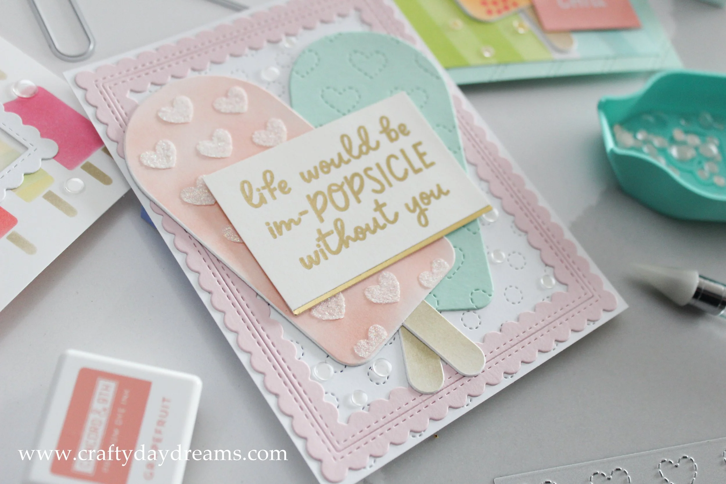 For the sentiment, I gold heat embossed ‘life would be im-popsicle without you’ on Ivory cardstock from Simon Says Stamp using Gilded embossing powder from Brutus Monroe. I cut a thin strip of Matte Gold cardstock, also from Simon Says Stamp and glued it along the bottom edge of the sentiment. While playing with placement, I found a Ballet Slipper colored Scalloped Rectangle frame in my stash, and when I laid it on the card, it was everything I needed. The frame is what I think gives it that sweet shoppe vibe, and it felt perfect! So I glued the Sea Glass popsicle down at an angle and added a little dimension behind the Grapefruit one and glued it on top. I popped the sentiment up using small foam squares from Simon Says stamp, and finished the card off with Rock Candy sequins from Trinity Stamps.