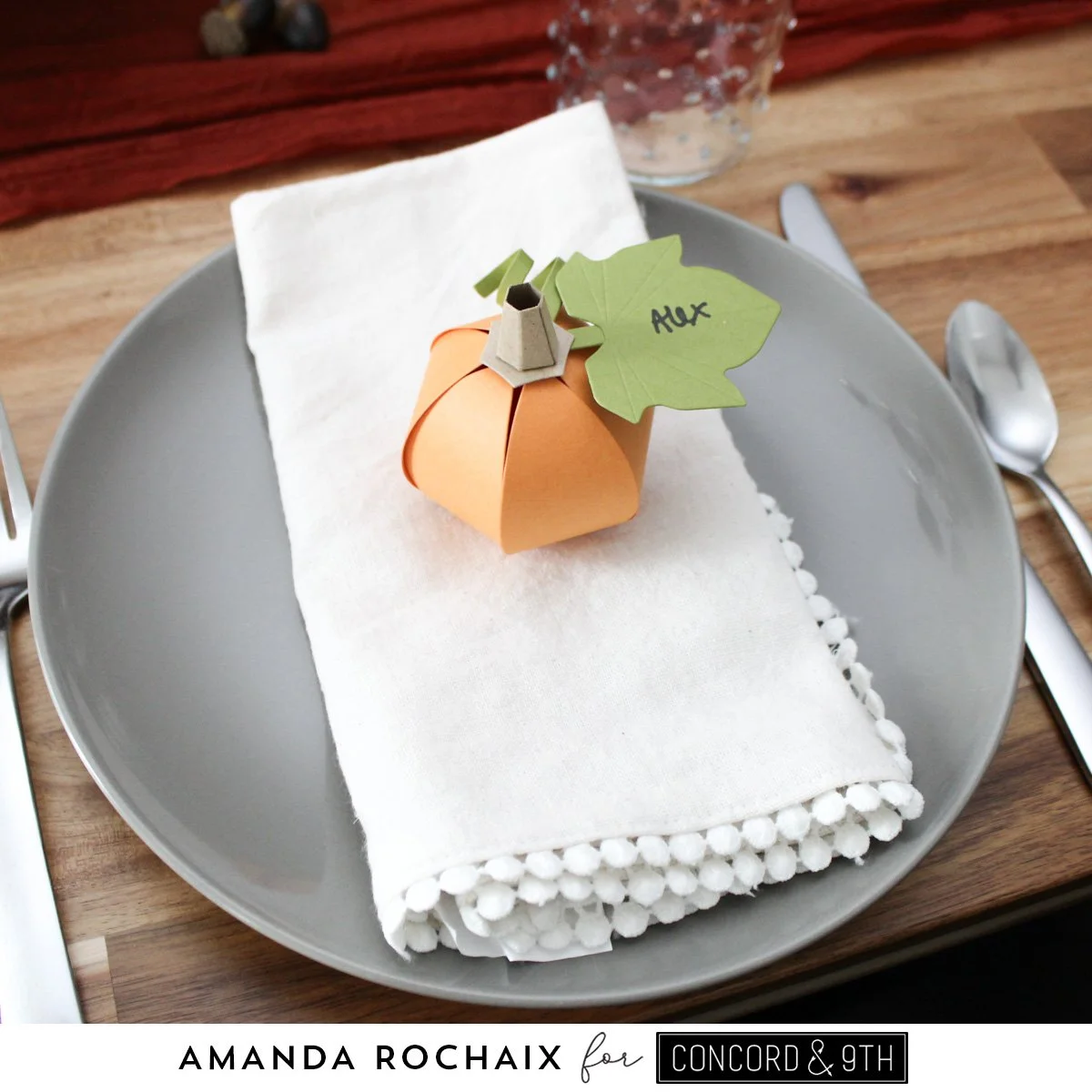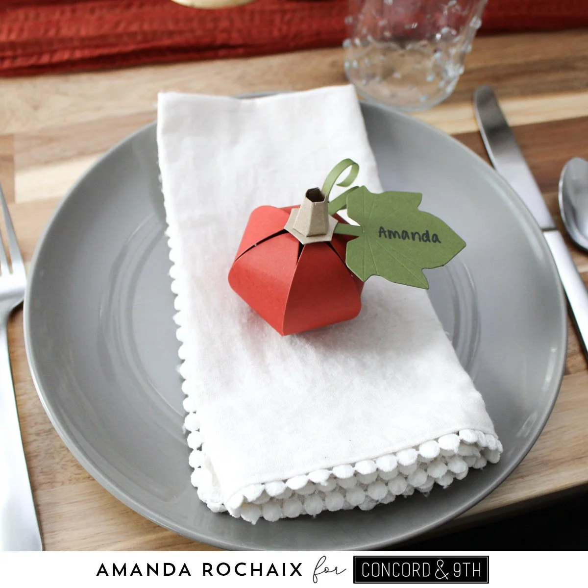 When using the leaves to write your guest’s name, I would suggest not folding on the score lines! The pumpkin is still super cute with a flat leaf, and it makes it the perfect place to write names.