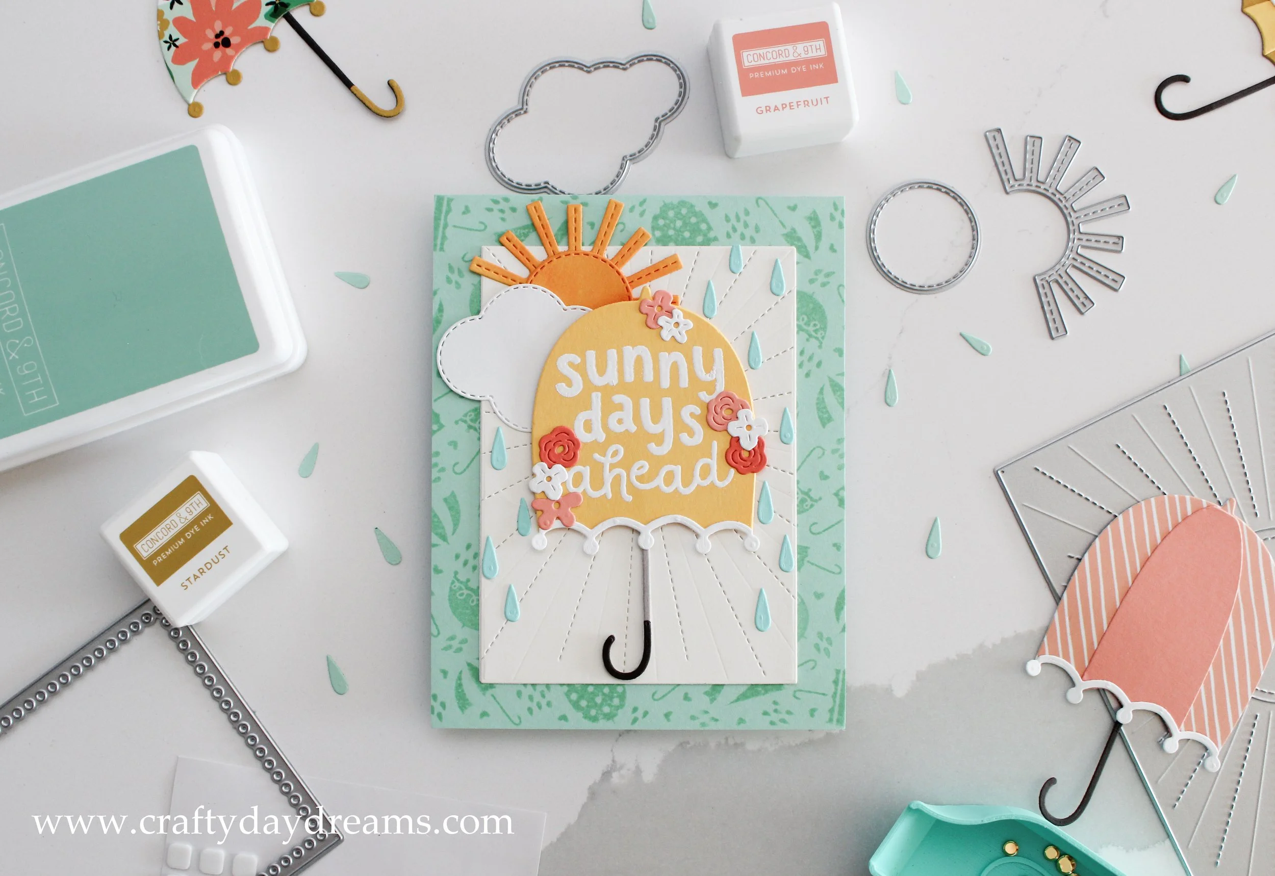 I started the umbrella off die cutting the main umbrella piece out of Buttercup cardstock from Concord & 9th, and the white accent piece from plain white cardstock. I white heat embossed the ‘sunny days ahead’ sentiment two times to give it a more prominent effect, which I love. At this point, I knew the umbrella needed something extra, so that was when I decided to use extra floral pieces from the Friendship Garden die set from C9 (hint hint, those cards are another unfinished project in my stack). I used florals in Grapefruit, Sorbet and white cardstock and glued them in a way so that the eye would kind of bounce to them (in a ‘z’ pattern) and it would frame the greeting nicely.