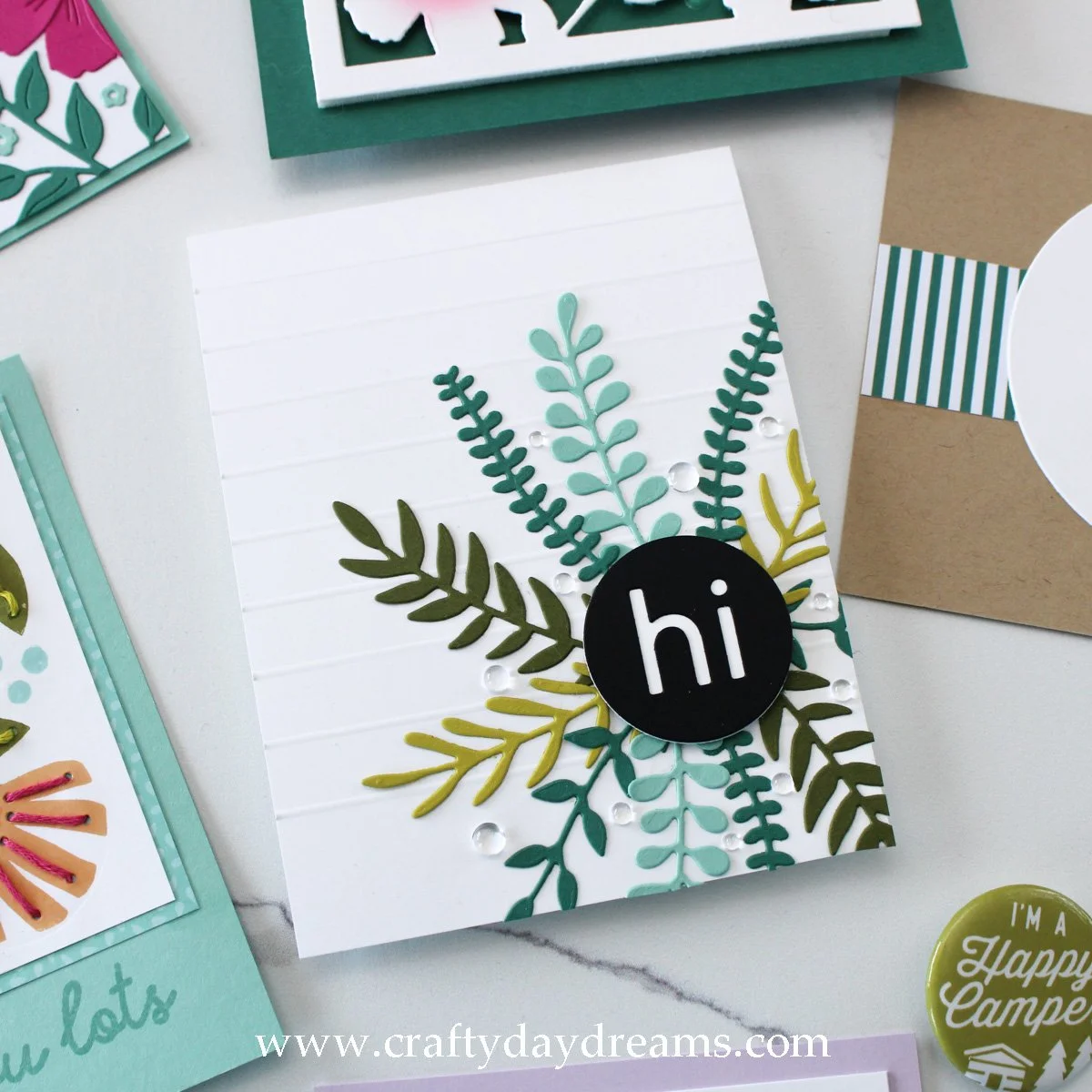 I die cut sprigs out of the same colors as was used in the Turnabout class— Tidepool, Juniper, Lemongrass, and Artichoke. I die cut the ‘hi’ out of black cardstock and a white backer using a nesting circle die in my stash. Before gluing things down, I decided to add some texture to the background by scoring at every 1/2-inch all the way down the cardstock until I got to the last inch, which I decided to leave unscored. With my sprigs glued down, I popped the ‘hi’ up on thick foam squares, then finished the card off by adding lots of dew drops!
