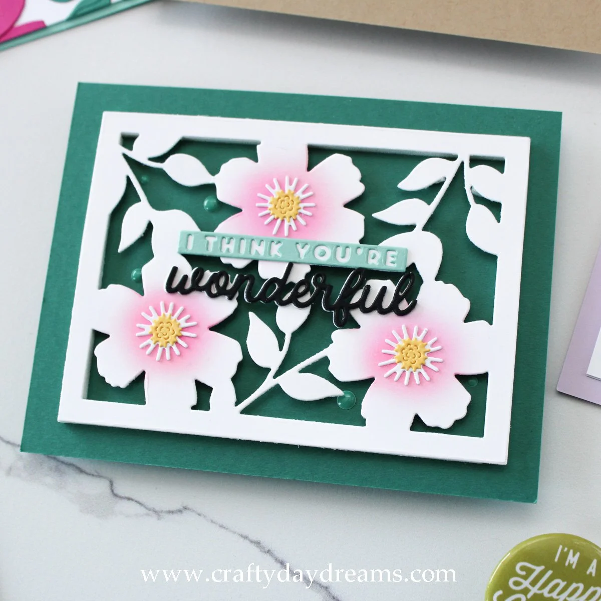 On this card, I took a little bit of artistic freedom. I noticed the greenery in the floral coverplate was very similar to the large greenery die in the In the Meadow die set, so I wanted to play around with that. I ended up deciding to use the ‘Thinking of You’ die from that same die set as my focal sentiment, then built a floral packed scene around it. The large flowers were die cut out of Dragonfruit with matte gold centers, the mini flowers from the Summer Sprigs die set were die cut out of Tidepool, and the leaves were die cut out of Juniper cardstock. I do like how this card turned out, but now I wish I cut the shadow to the sentiment die out of my panel then inlaid the ‘thinking of you’.