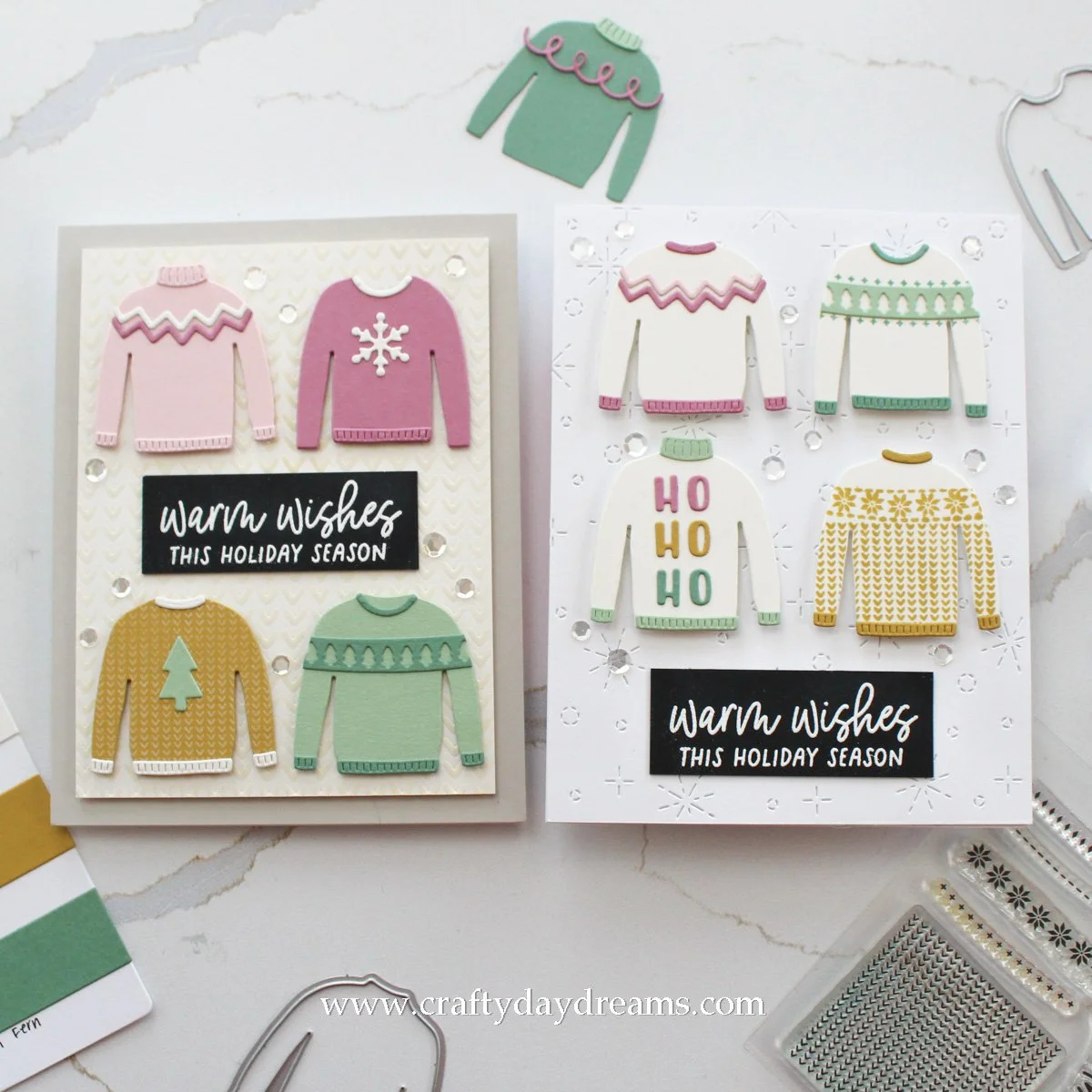 I had so much fun putting these cute sweaters together! The first one is cut out of Ballet Slipper and has Ivory and Briar Rose zig zags. The second one is Briar Rose and has a snowflake and collar cut out of Ivory. The third one is cut out of Stardust with knit details stamped in white pigment ink, Ivory cuffs and collar, and a Matcha tree. Lastly, the green sweater is die cut out of Matcha and has cuffs, a neckline, and the tree stripe cut out of Fern cardstock. I absolutely love these sweaters!