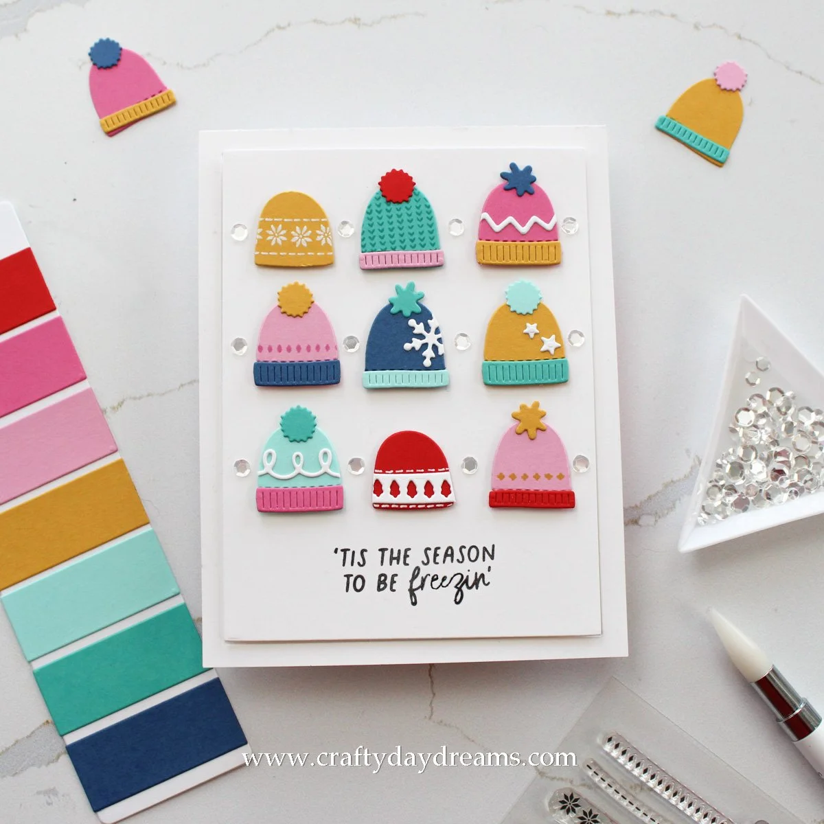 Since I liked how those details were looking, I decided to add some stamped details to the hats that didn’t get die cut details. I stamped two dash stripes and a snowflake stripe in white pigment ink on the Sunflower hat in the first row, but after it dried, I didn’t think it was a white enough impression, so I went over it with my white gel pen. I stamped the knit pattern on the Oceanside hat next to it in Oceanside ink for some tone-on-tone love. The two Carnation hats have diamonds stamped in Sweet Pea ink, and plusses stamped in Sunflower ink, respectively. I love all the little details on these hats!