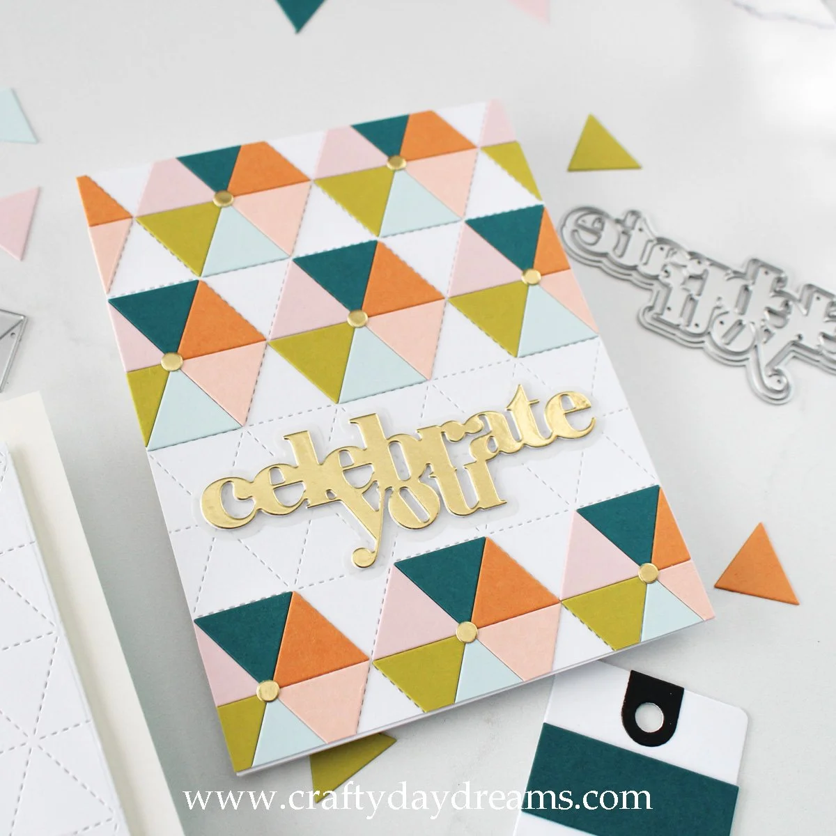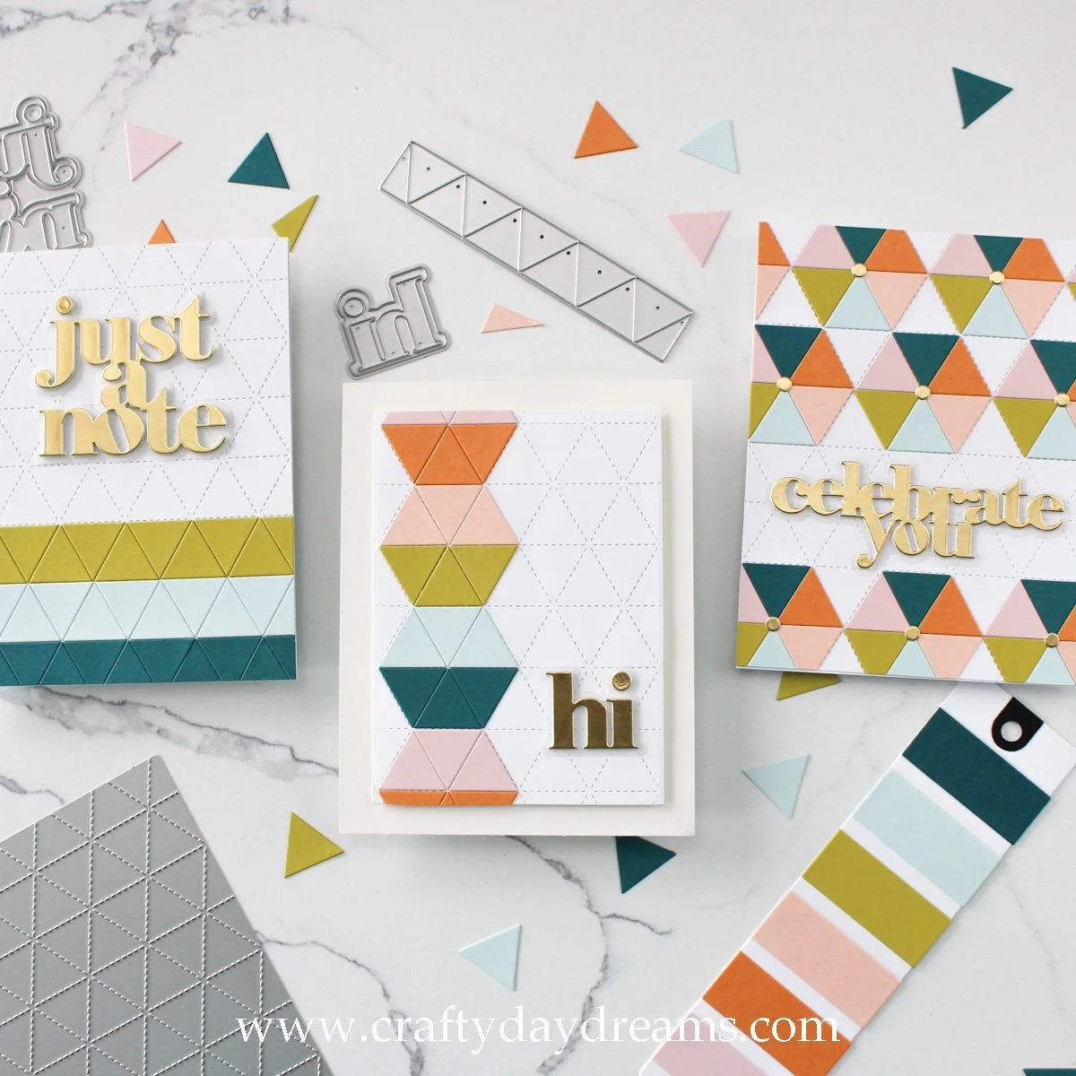 After making a Father’s Day card last week with the Triangle Background die, I really wanted to play with the die set again. It’s so much fun and is pretty therapeutic to use (much like how I imagine people feel when working on diamond paintings!), so I got to work picking out a color palette. I created this color palette with inspiration from this pin using Peacock, Powder, Lemongrass, Nectar, Clementine, and Ballet Slipper cardstocks.