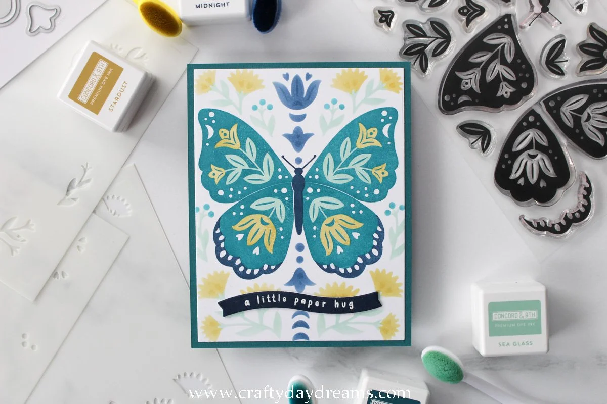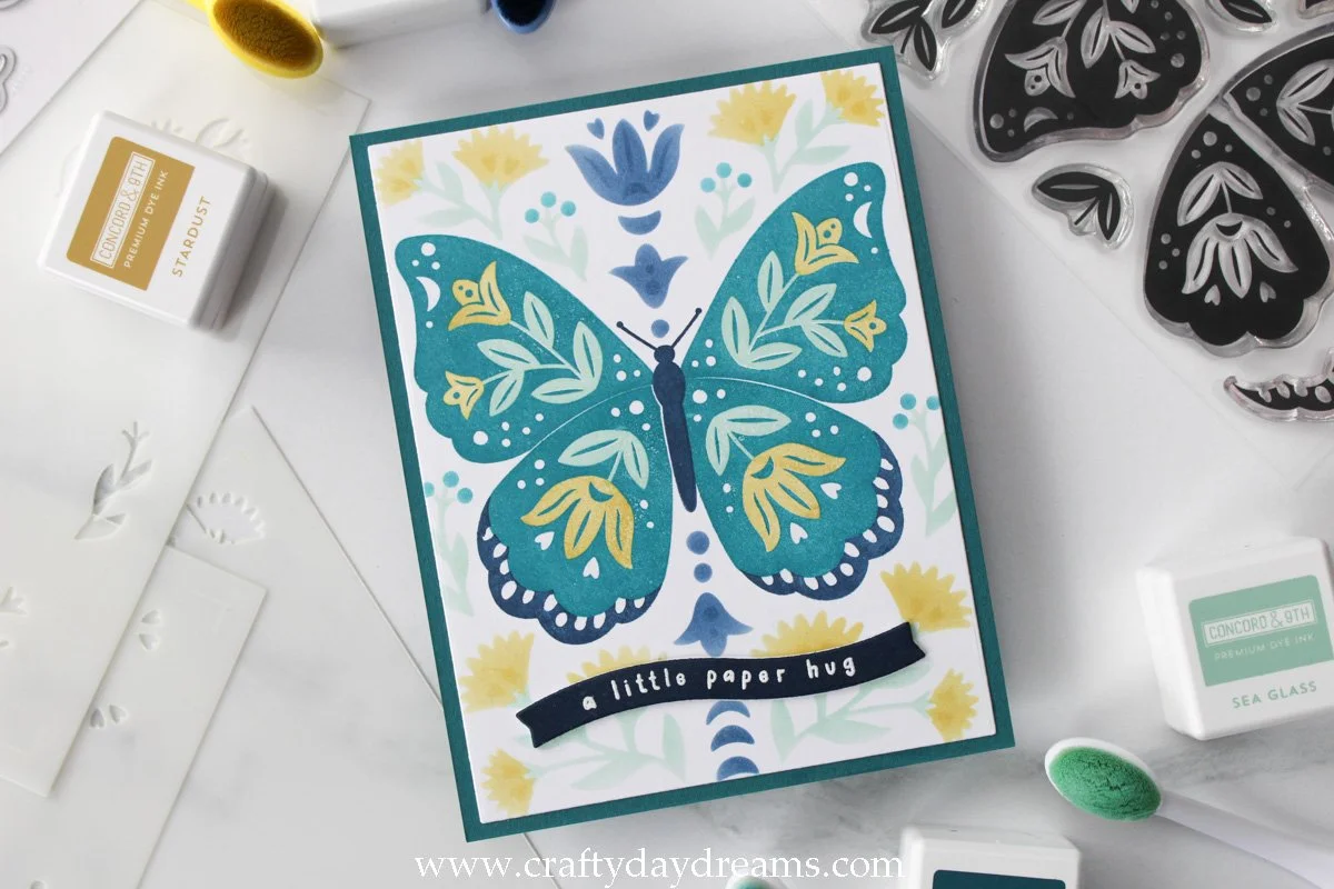Today I’m sharing a card featuring one of the products from Concord & 9th’s November 2022 release! This bundle, called the Whimsical Wings bundle, is amazing!!! I absolutely love it. I love the style of the art, I love the stencils included, and I am head over heels for the multi-step butterfly stamp set. This bundle really allows you to go so many different directions— the dies allow you to create a plain cardstock butterfly, you can die cut your stamped butterfly, and you can even create a delicate stitched butterfly. Butterflies can be so multipurpose for cards too! You can use them for sympathy, birthdays, spring cards, baby cards, Mother’s Day…. and the list goes on! This product is really well designed, and I love that it feels similar to how the Triple-Step Hi, Triple-Step Heart, and Triple- Step Autumn Leaf were designed.
