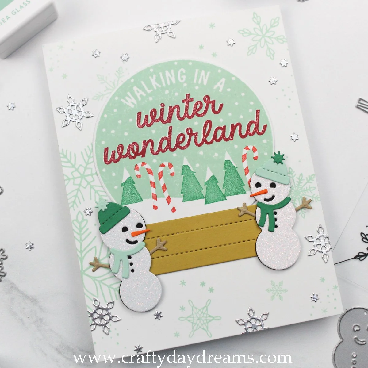 I die cut the snowmen out of C9 white glitter paper so they would stand out enough from the background, and glued a black shadown behind them. The noses and arms were die cut out of Marmalade and Wheat cardstocks, and the hats and scarves were die cut out of Sea Glass and Clover to tie back to the snow globe scene.