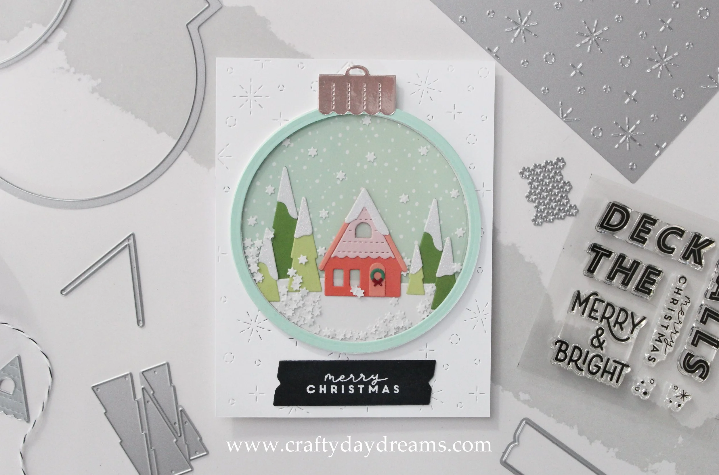 Once I had my idea, I started slapping things together. I die cut the outer ornament layer out of Sea Glass cardstock and the ornament topper piece out of Rose Gold cardstock. The shaker scene was made by using the same circle die (part of a SSS nested circles die set) that cut the shaker window on a piece of Sea Glass speckled cardstock from the Garden Party patterned paper pack. This makes the perfect snowy sky. I took the hillside die from the Home for the Holidays die set and die cut one of the many fallout circles I had from making the shaker frame which allowed me to get the perfect curve to the snowbank. I used Sprout and Parsley trees that I topped with C9 white glitter paper, which I also added on top of the house. The house was made out of a Sorbet base, Grapefruit roof and door, and Ballet Slipper cedar shake siding piece. The windows do have two layers of vellum behind them to make the windows look a little frosted, and the wreath on the door was die cut out of Clover and Cranberry cardstocks. I tucked two of the trees behind the snowbank to add depth to the scene and glued the rest in a staggered arrangement on top off the snowbank.