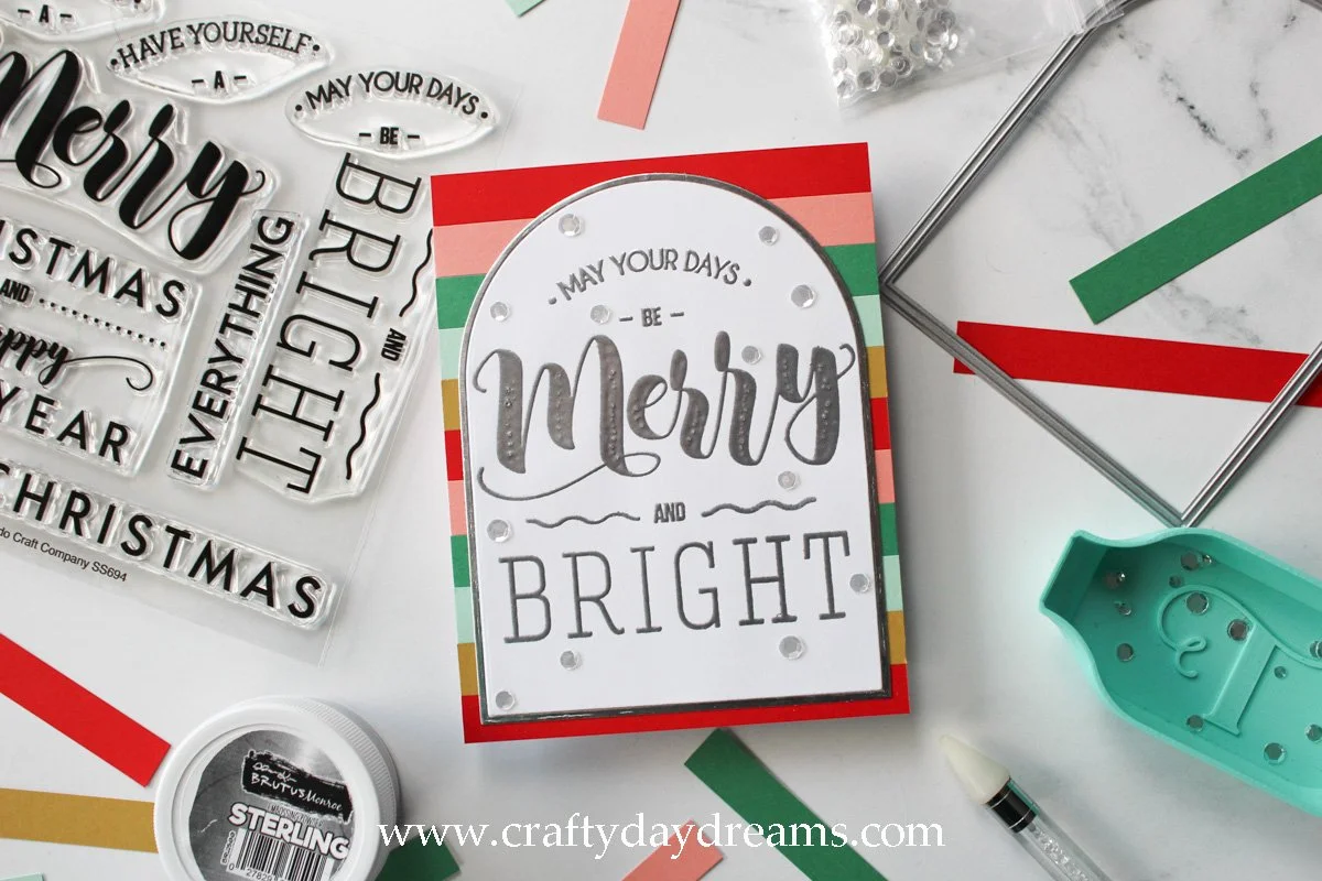 Since the sentiment is so large, and I really wanted to put it on display, I chose to heat emboss it using Sterling embossing powder from Brutus Monroe, and I did so twice. I love the added thickness heat embossing two times added to the sentiment, and I feel like it really makes it pop! While heat embossing, I did run into some issues with the embossing on the ‘merry’ but I did my best to smooth it out with my heat gun, but in the end it left texture on the downstrokes of the letters, but that’s okay! This is handmade and not Hallmark, am I right?! Once the heat embossing was done, I decided to die cut the sentiment out using one of the larger arch dies from the Essential Arches die set from Ellen Hutson. I really love this die set, and you’ll be seeing a bit more of it in the next week!