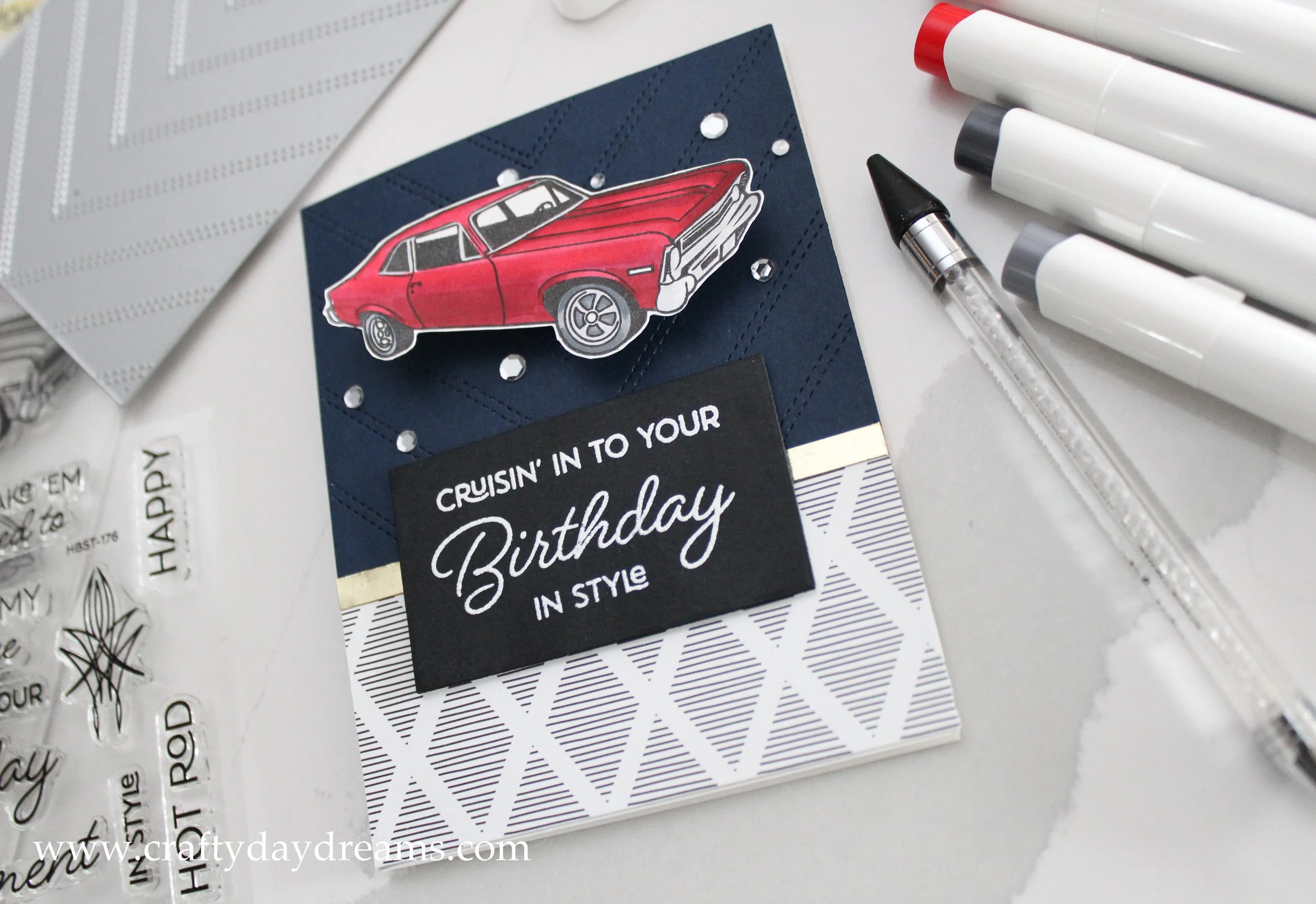 Today I’ve got another birthday card to share, and this time it’s a clean and simple, masculine one. I made this card for my uncle, and I had actually bought the Car Show stamp set from Honey Bee last fall. My uncle has a ‘69 Chevy Chevelle and I when I saw this stamp set I thought of him right away. However, my dad told me when I was making this card that the car on the front is Chevy Nova and not a Chevelle. I was crushed! But my sweet aunt who knew I was making this card for my uncle told me that it was the thought that counted, so I stuck with my ideas and finished the card. I’m so glad I did, my uncle absolutely loved it when he got it.