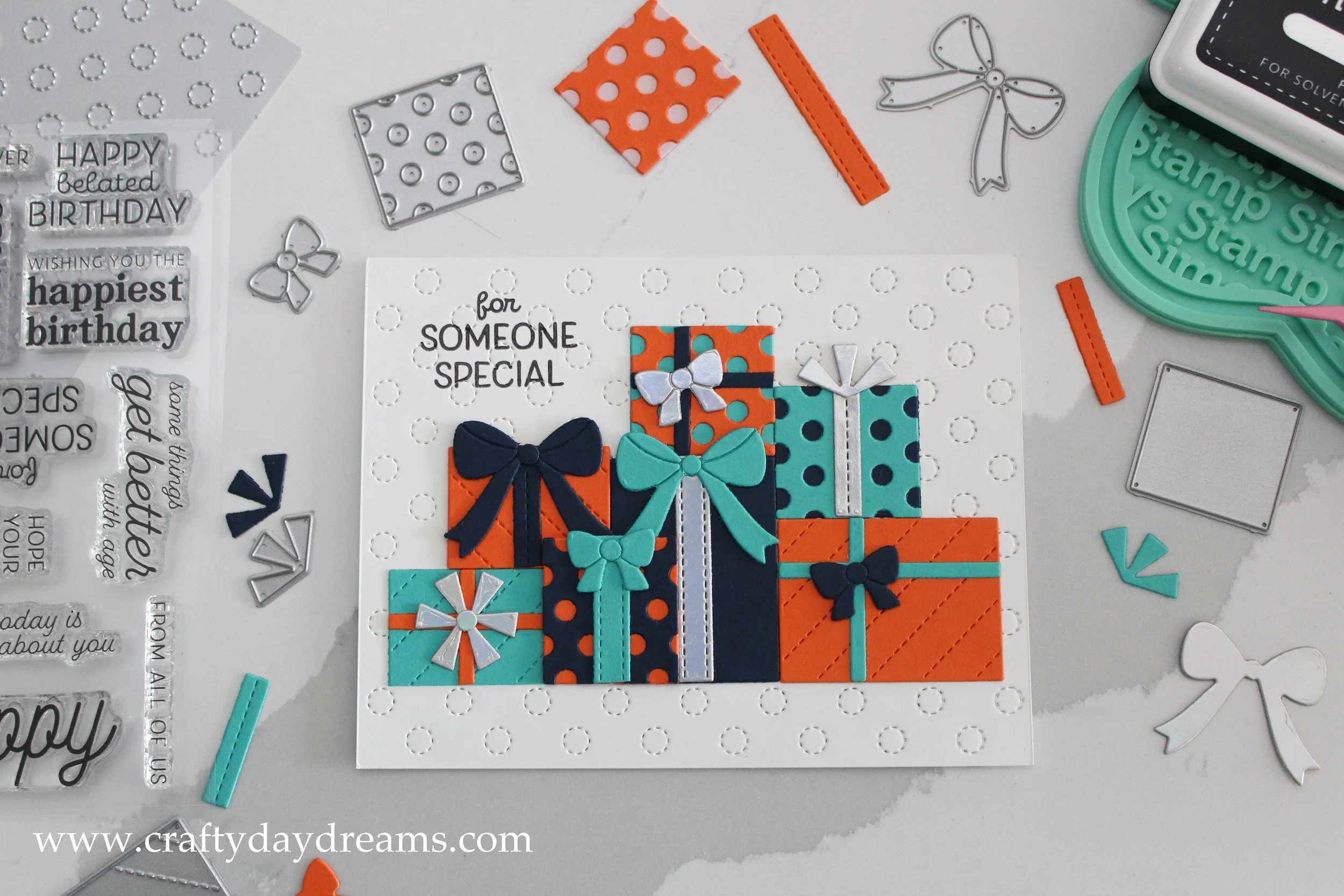 When I laid the presents out on the card front, I thought the background was a bit plain. I didn’t think colored paper or patterned paper was the way to go, but I had just gotten my June Concord & 9th order in the mail when I was making this card, so I decided to use the new Stitched Polka Dot card front die. I think this background die paired perfectly with the presents, it plays nicely with the dots on the presents and the stitching on the ribbons. After gluing the presents down, I decided I wanted a sentiment on the front of the card. I thought about stamping one on cardstock and placing it in the corner, but to me, it was too much visually. I ended up stamping ‘for someone special’ from the Spellbinders Many Birthdays stamp set (LOVE this set!) in Simon Says Stamp Intense Black ink. I ended up stamping a couple times to get a dark, clear sentiment since the stitching in the background was being stamped over. In a couple small spots, I took a black Micron pen and filled in where the stamp didn’t make contact. For the inside sentiment, I also used the same stamp set and stamped a simple ‘happy birthday’ so I had plenty of space to write my personal message.