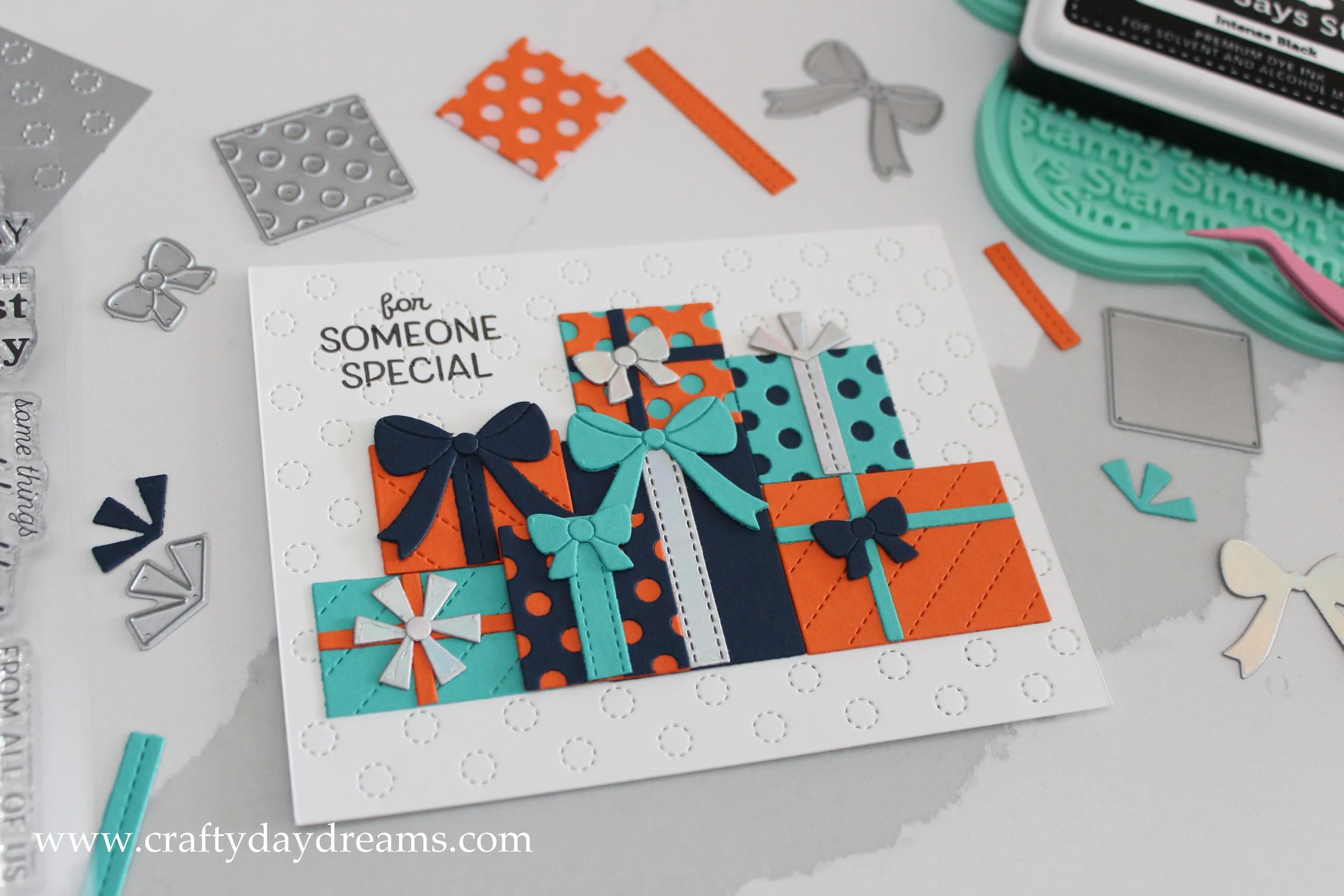 When it came to placing the presents on the card front, I wasn’t sure how I wanted to lay them out, so I went to Pretty Pink Posh’s website to look for some inspiration. I liked how Lindsey Larsen on their design team had stacked their presents, so I decided to do something fairly similar. Another thing I learned this time around using this die set, is to cut presents down and make different shapes out of them, and to glue them down in different ways (like vertically or horizontally). I cut the large stitched one in half and made a smaller rectangular gift out of it. You could even cut the square dot one in half and make a cute, thin rectangle present. Also, don’t be scared to Frankenstein the ribbons and bows! For one of the presents, I took two of the spiky bows and glued them together and covered the seam with the circle that one of the other bows cuts out. I love how it turned out!