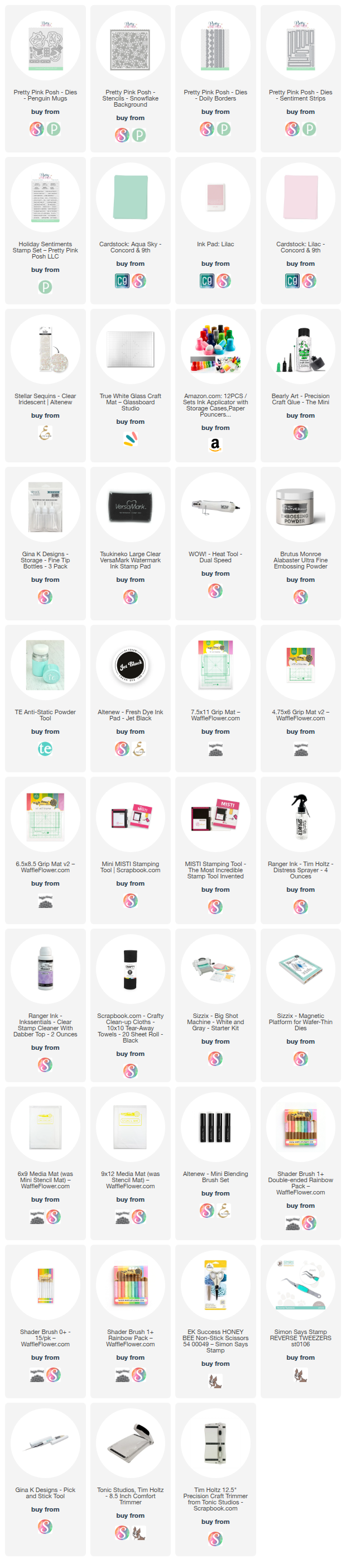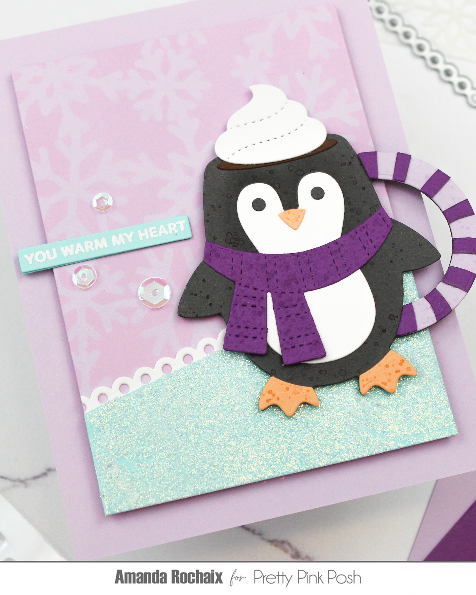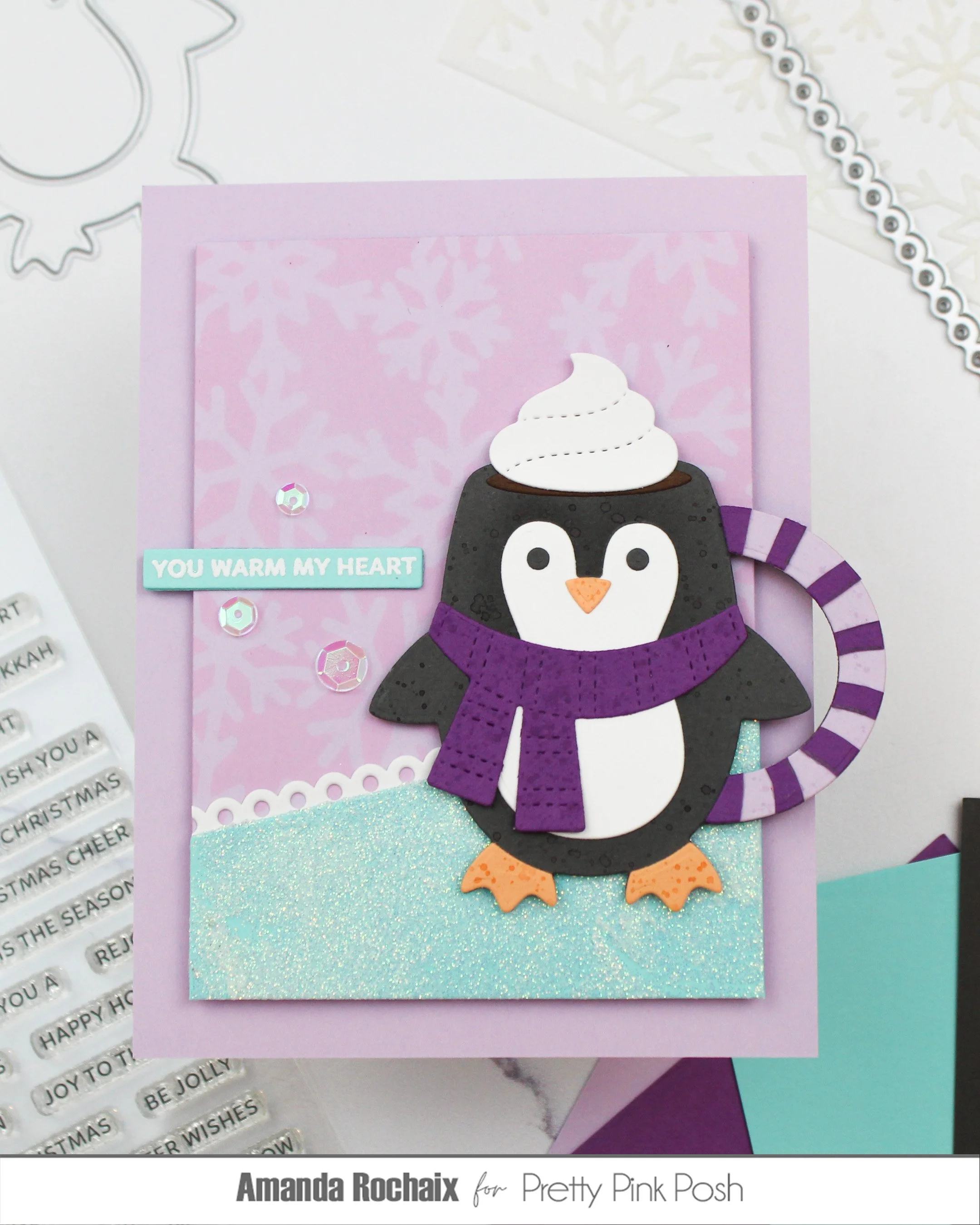 I created this card back in November for Pretty Pink Posh, and this one was so fun! I adore mugs (not sure what triggered me to have such an extensive mug collection, but here we are), so I was thrilled when I got the Penguin Mugs die set in my guest designing package! While this card could be used as a Christmas card, I thought would also be great as a post-holiday, wintry thank you card. Cute, right? On to the details!