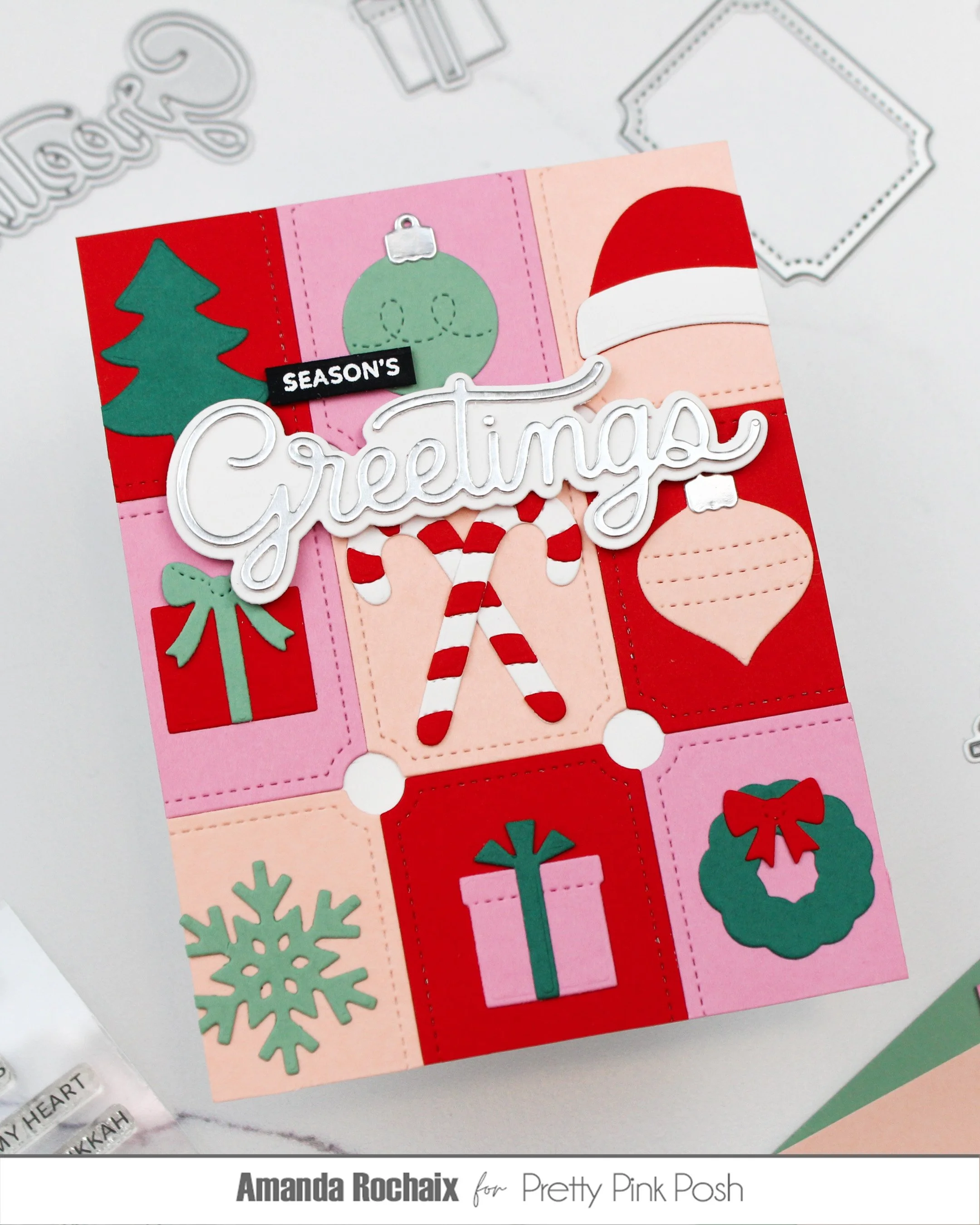 Now comes the fun part! I pulled out the Christmas Holder Add-on die set, and die cut the Santa hat, one of the presents, the candy cane details, and the small bow out of Poppy cardstock. I die cut the Santa hat trim and the candy canes out of white cardstock, the pointy ornament out of Nectar, and one the presents out of Carnation. The Christmas tree, wreath, and pointy bow were die cut out of Juniper cardstock, and the round ornament, snowflake and long bow were die cut out of Eucalyptus cardstock. For the ornament toppers, I chose silver metallic cardstock since the tones of it worked really well with these colors. I assembled all of the cute little icons, then adhered them to the rectangles. I didn’t have any rhyme or reason with where I glued them down, except that I wanted the colors to pop.