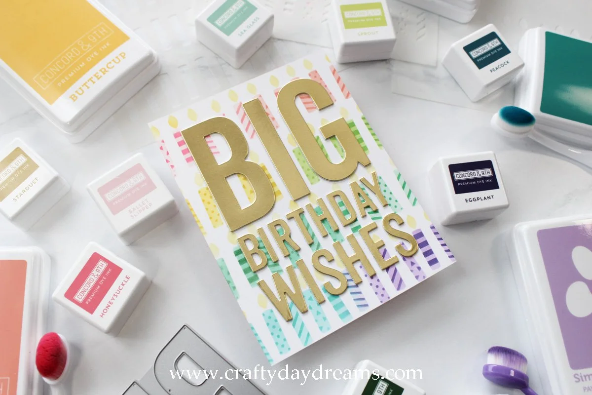 I love this card! Blue tones are some of my favorites (especially Concord & 9th blue inks), and I love how this card can flex to be perfect for a blue lover, or as a masculine birthday card! For this card I pulled out Sea Glass, Aqua Sky, Oceanside, and Peacock inks from Concord & 9th to make a sort of ombre-like gradient of candles. I lined up the second stencil to add details to the candles and blended them in the same color of ink but with a heavier hand, and I finished the candles off by blending Buttercup ink for the flames.
