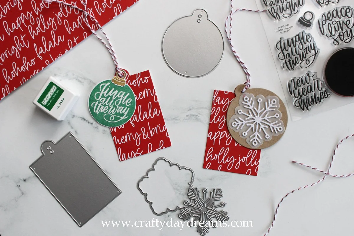 Today’s tags are quick and simple! The star of the show is the red patterned paper from Concord & 9th. This paper is from the Be Merry paper pack that was released this past September, and I love it! I love the scripty holiday messages that are on it, it’s such a classic! To make these tags, I used the rectangular tag die from the Farmhouse Tags die set from the Essentials by Ellen line at Ellen Hutson and die cut it out of the patterned paper twice, as well as plain white cardstock twice. I really like these tag dies especially since you get three different shapes in this set! With my tag bases cut out, I glued them together so the pretty/nice sides of each were facing the outside. Not only does this make the back of the tag look nice, but it added a nice bit of strength to it.
