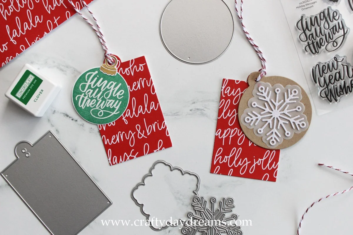 Honestly, this paper is pretty enough that if you wanted tags that showcased it more, you could just stop here! But, I decided to take it up a notch. For the version with the green ornament, I used the Holiday Messages Ornament stamp set and coordinating dies from Simon Says Stamp. I stamped the ornament in Clover ink from Concord & 9th, ensured it was fully dry, then white heat embossed the ‘jingle all the way’ scripty message on top of it. While waiting for that to cool down, I stamped and gold heat embossed the ornament topper. After die cutting the topper and the ornament, I glued them together, stacked it over the hole in the rectangular tag, then threaded some twine between them. Such a super quick and easy tag, especially if you want mass production!