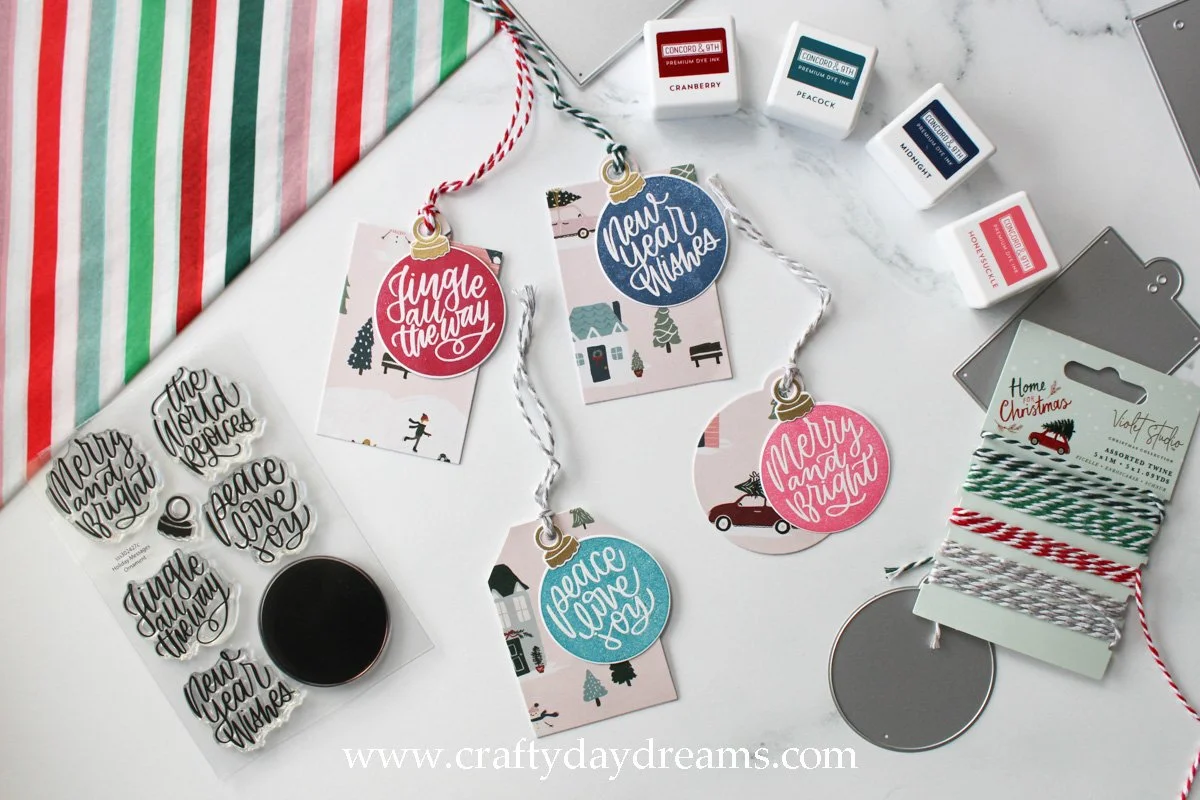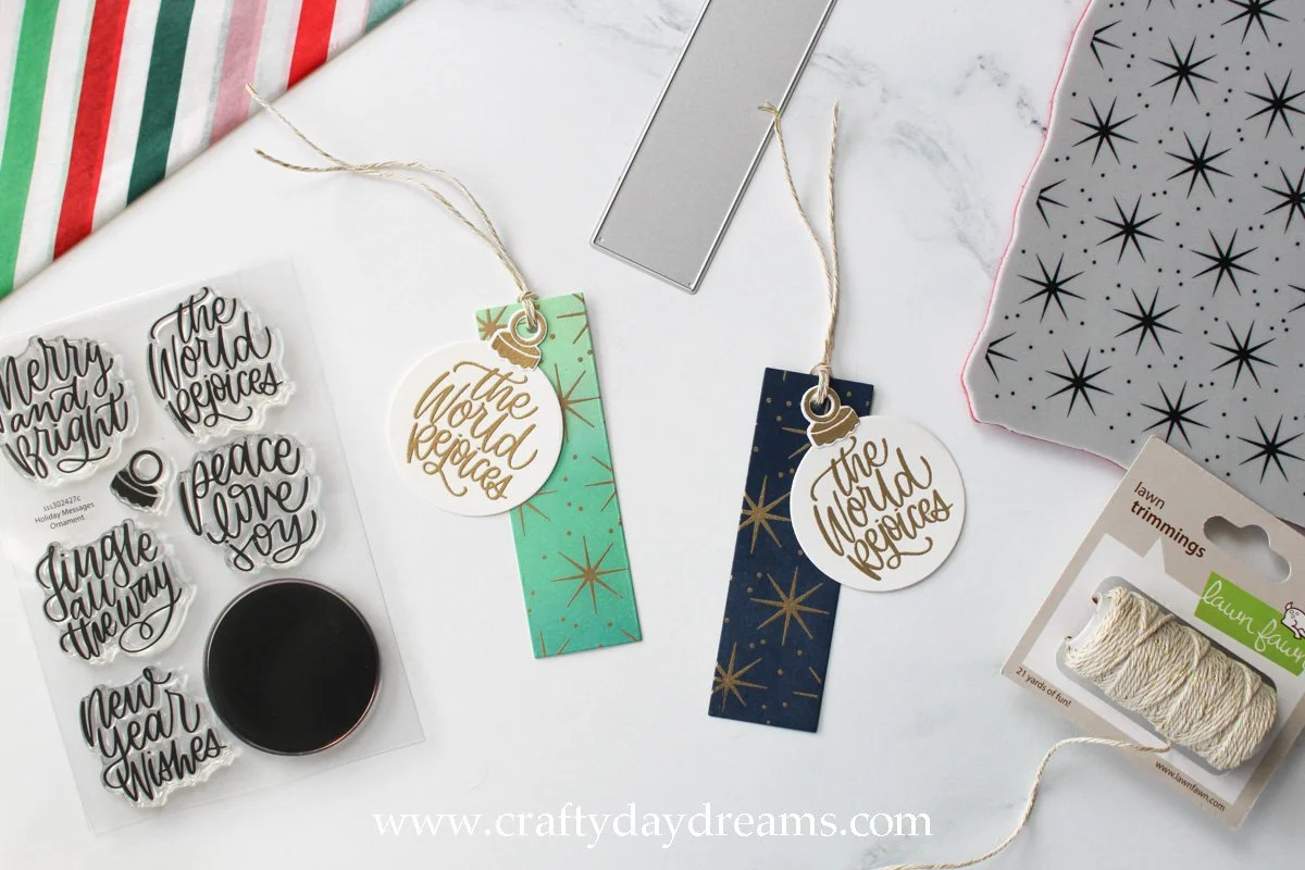 After making my last set of tags, I really fell in love with the Holiday Messages Ornament stamp and die set from Simon Says Stamp. So, I decided to use that stamp and die set again on these tags. This post focuses on two ways to make tags: using patterned paper and using scraps from past cards.