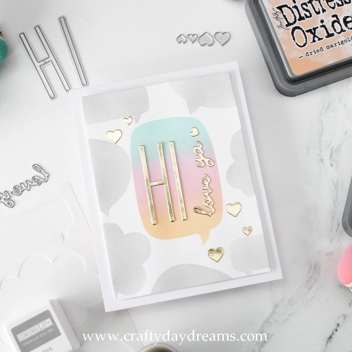 Once that bubble dried a bit and I cleaned off the stencil, I brought my template back in in the same way, and went on about lining up the stencil and blending in the background talk bubbles in Dove ink from Concord & 9th. I really love this soft grey, and I think it suits this card well. I cut down my blended background by a 1/4-inch on each side, added some foam tape to the back of it and stuck it down on a white top folding card base.
