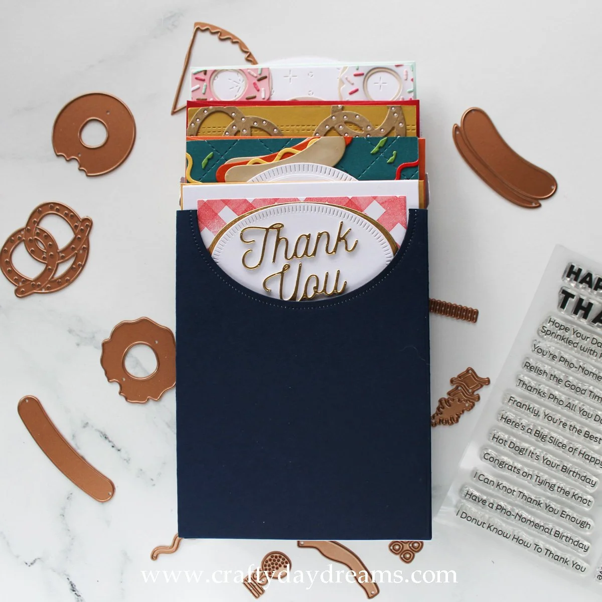 So sorry for being MIA on the blog last week, I’ve been making this set of cards and maybe putting a little too much detail into them haha! But, I’m finally done and so excited to share them with you! I had picked up the Sweet & Savory die and stamp set from Spellbinders last summer to go with the Food Truck large die of the month. I ended up only making one card with them and shoved in a bin for later use. I finally got around to playing with this set again, and I’m so happy I did! These cards are so cute, and with the help of the Stationary Box die from The Greetery, I made a nice boxed set of food pun thank you cards. I bought the box die set late last summer as well with the intention of making sets of cards as Christmas gifts, but I hadn’t gotten around to it.