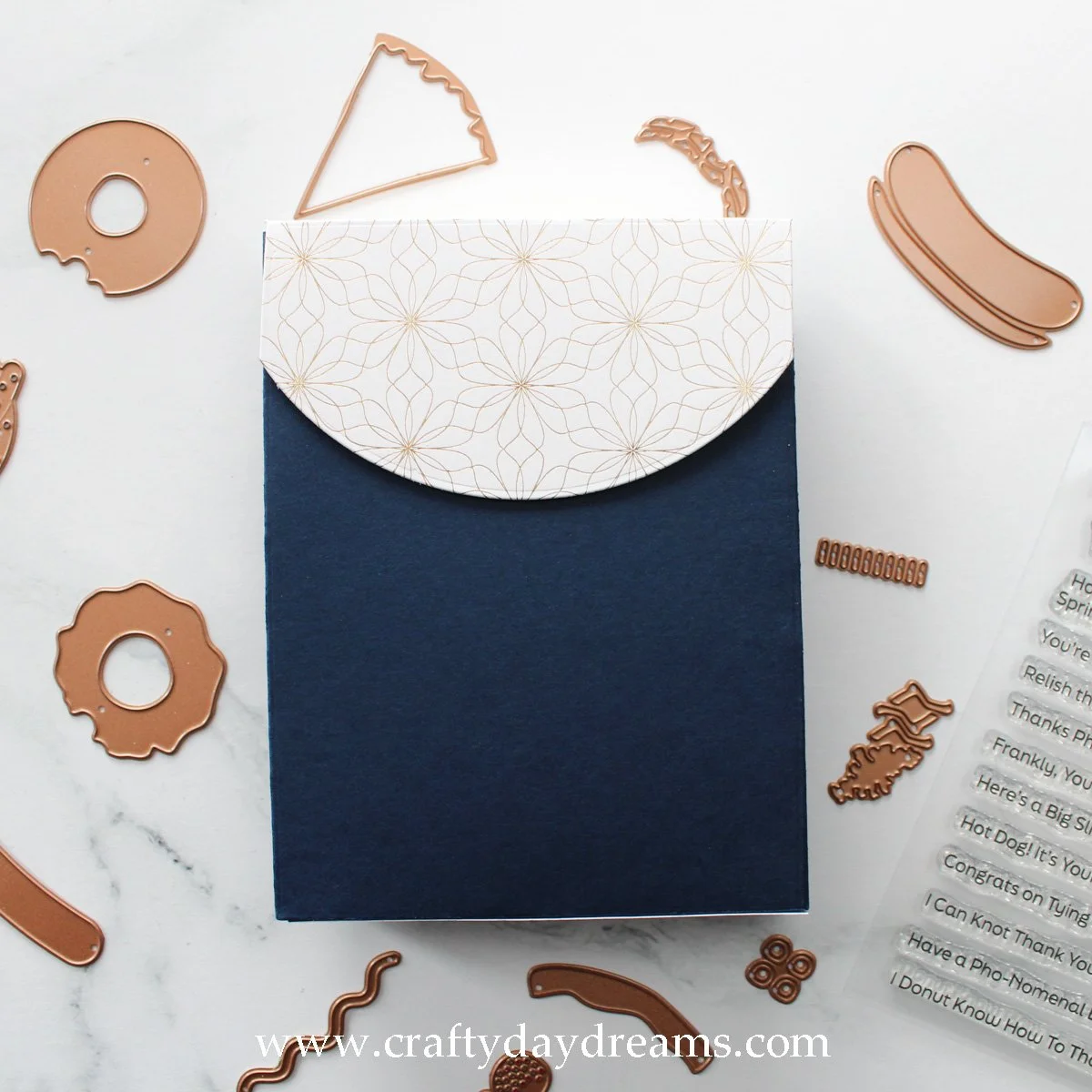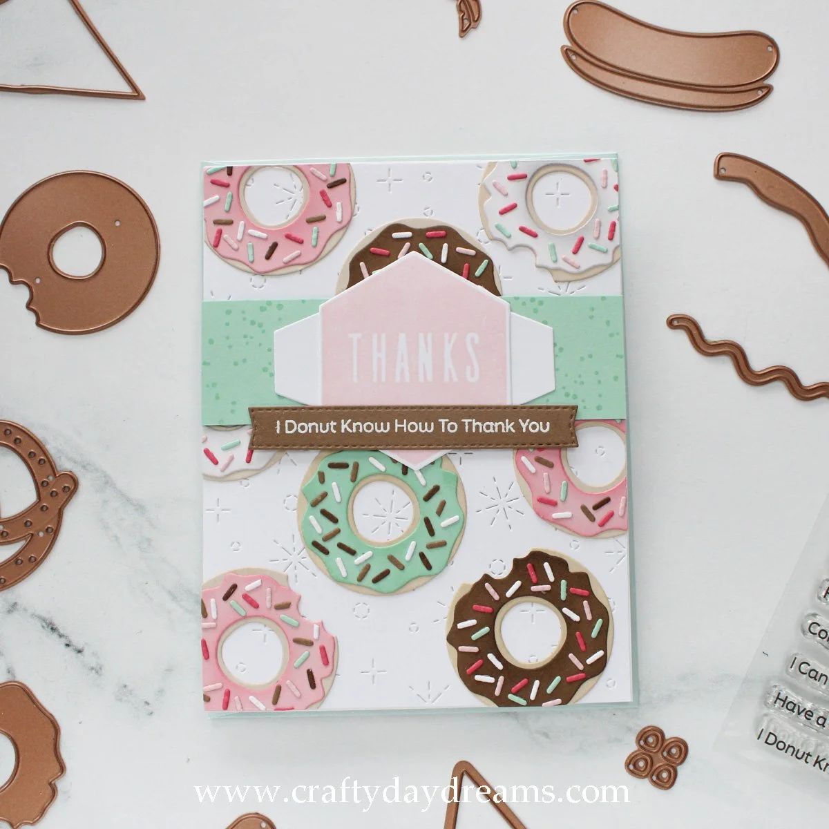 For the sub-sentiment, I white heat embossed ‘I donut know how to thank you’ on the same mid-tone brown cardstock as the donut, and cut it out with a stitched banner die from a Concord & 9th die set. I love how the sentiment as a whole pulls from all the colors of the card, and I think that adds a nice cohesive feel. I placed the donuts in a random pattern while trying to not make them feel too repetitive or liner, then glued them down. I popped the Sea Glass strip up on thin foam squares from Simon Says Stamp, then glued the hexagon sentiment down. Since the sub-sentiment was straddling the Sea Glass strip, I trimmed a foam square in half and added it the bottom edge of it to add some support. This card was by far the most detailed out of all four, so it’s all downhill from here!