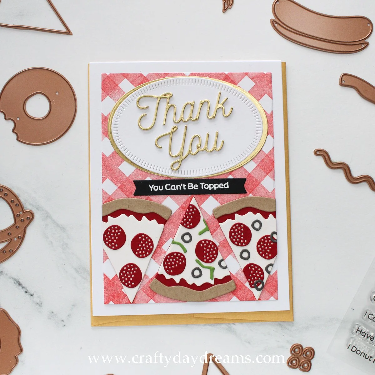 For the sentiment, I pulled out the ‘thank you’ from the Smooth Lines Mix & Match Sentiments die set from Spellbinders. I die cut two layers out of plain white cardstock and one out of SSS matte gold cardstock and glued them together. While that dried, I decided to build my sentiment on an oval for this card, so I die cut the largest oval from the Essentials Blanket Stitched Oval die set out of plain white cardstock. I wanted a mat under it, so I pulled out my Nesting Ovals die set from Waffle Flower and chose one slightly larger and die cut it out of the same SSS matte gold cardstock. I white heat embossed the ‘you can’t be topped’ sub-sentiment on C9 black cardstock and cut it out with the same sentiment strip/banner die as the first and last card. I glued the sentiment, sub-sentiment and pizza slices on the card front, trimmed off the excess and matted the panel on a white 4.25 x 5.5- inch card base.