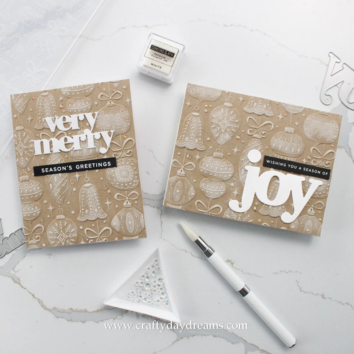 So anyway, back to the cards! Today’s post is all about these two cards I created using the Vintage Ornaments 3D embossing folder from Spellbinders. I fell in love with this embossing folder a couple months back and picked it up, but didn’t make anything since I didn’t know how I wanted to use it. Well, after I created three cards using the 3D embossing folder in Altenew’s Flourishing Garden Craft Your Life Project Kit, I decided to follow that ‘formula’. For some reason this holiday season I’ve been obsessed with kraft cardstock and white pigment ink, so I figured what better way to create with this folder!