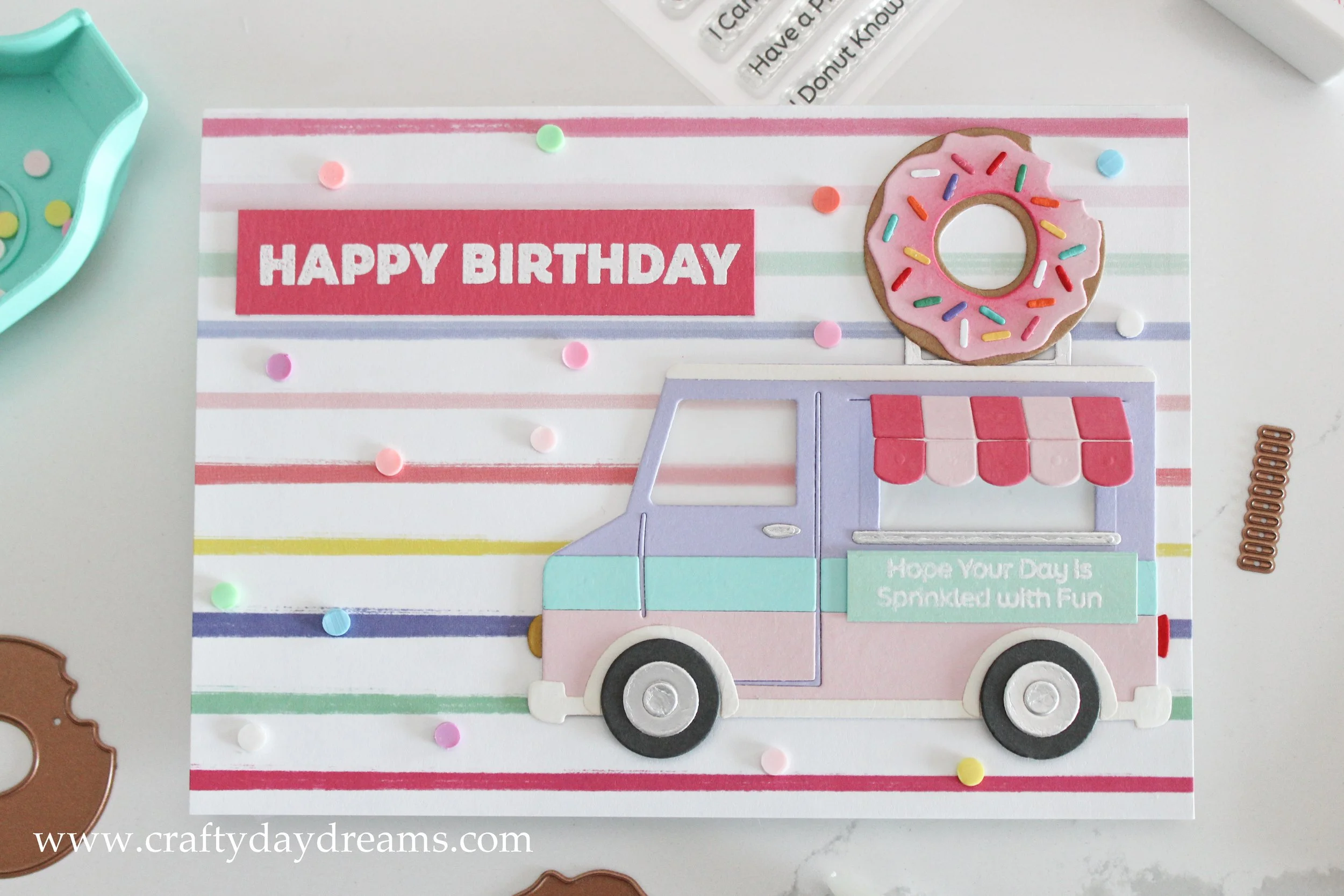 I popped my food truck and sentiment on the card base and finished the card off with Rainbow Dots polymer clay confetti from Studio Katia to tie into the sub greeting.