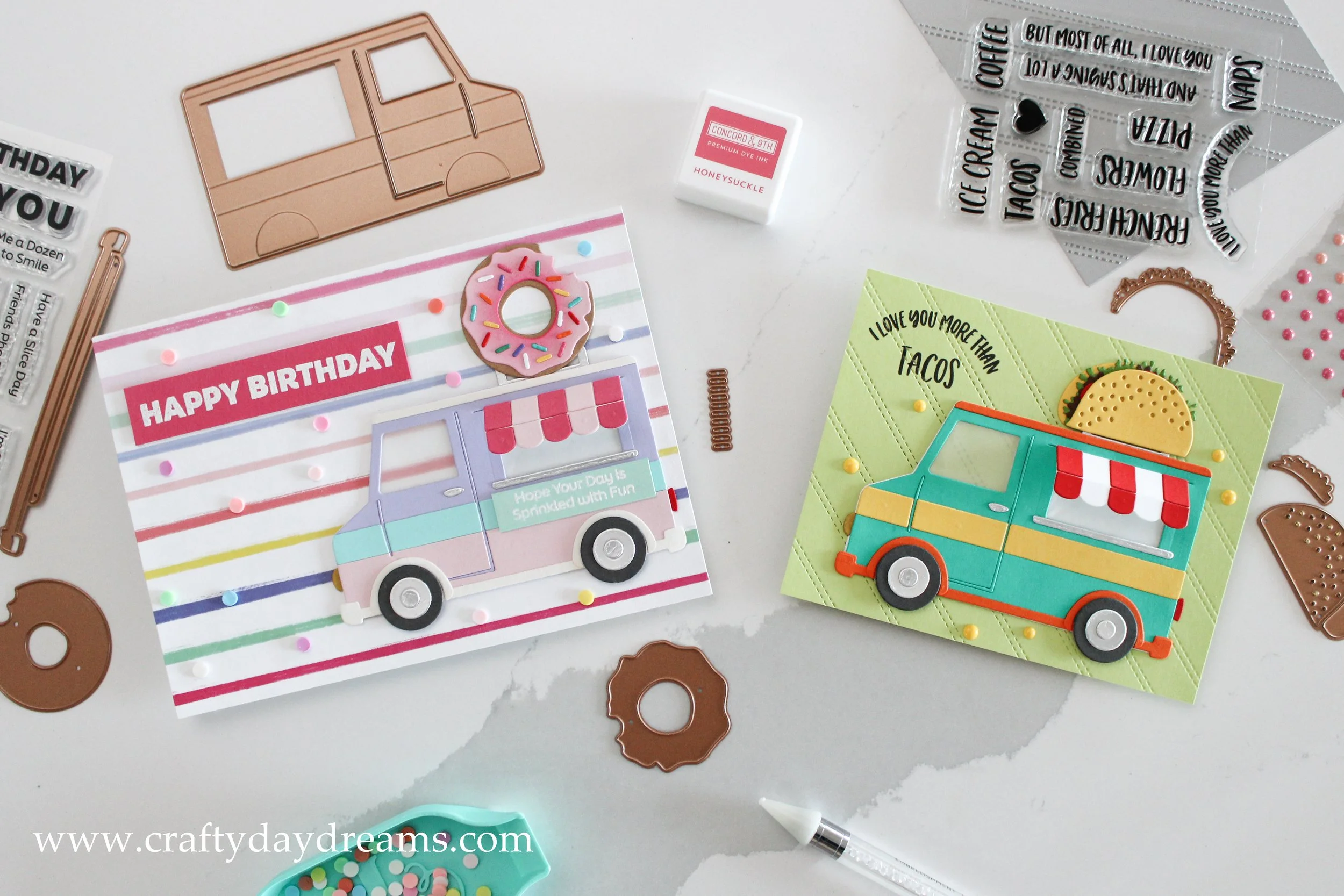 Today I’m sharing two super cute food truck cards I made using the Spellbinders Large Die of the Month from July 2022. Once I saw the dies revealed for July, I actually subscribed to the die + stamp addict value club for $42, but I ended up cancelling my subscription for August since I wasn’t as interested in this month’s products as I was for July. The nice thing is you can subscribe or unsubscribe whenever you want, no questions asked, and there are cheaper subscription options as well. Since July has passed, if you are interested in this die, I believe Spellbinders does add their large die of the month dies to their shop, but I think it takes a couple months before they do. So if you like it, be on the look out!