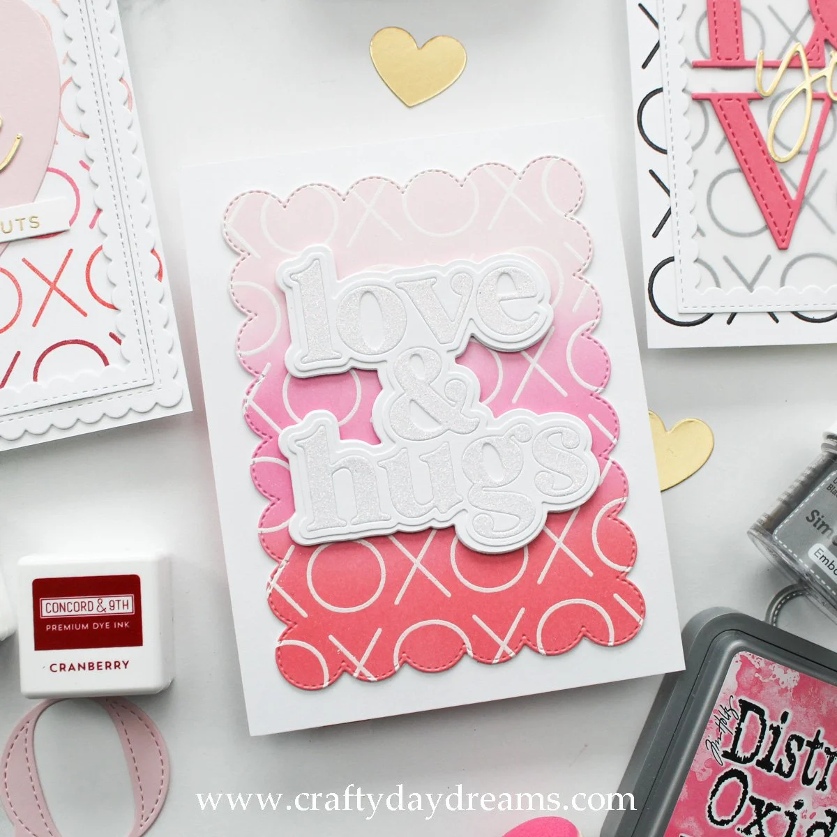 Now onto our last card! This one features oxide resist, which if you follow the blog, you know is my favorite! What’s a better way to create a Valentine’s card than with a Valentine’s themed ink blend? For this card, I white heat embossed the XOXO stamp and made a linear blend of Spun Sugar, Picked Raspberry, and Festive Berries on C9 white cardstock. Once the panel was blended, I had the idea to use the ‘love & hugs’ greeting from the Sweet Sayings die set form Concord & 9th’s January release. I ran the die thru my Platinum 6 with plain white cardstock, then with C9 white glitter paper. I decided that I would use the white glitter paper for the letters, and leave the rest of the greeting white.