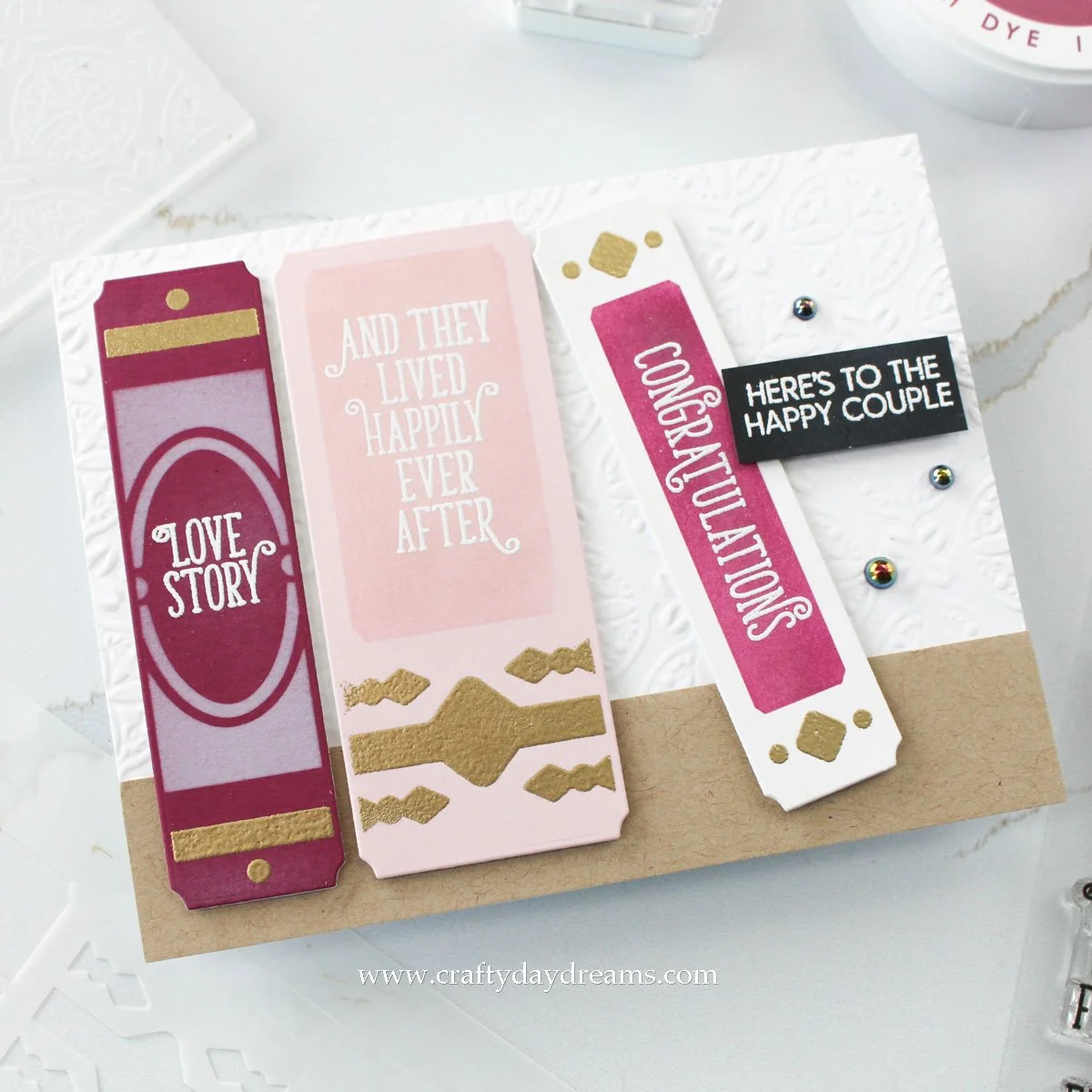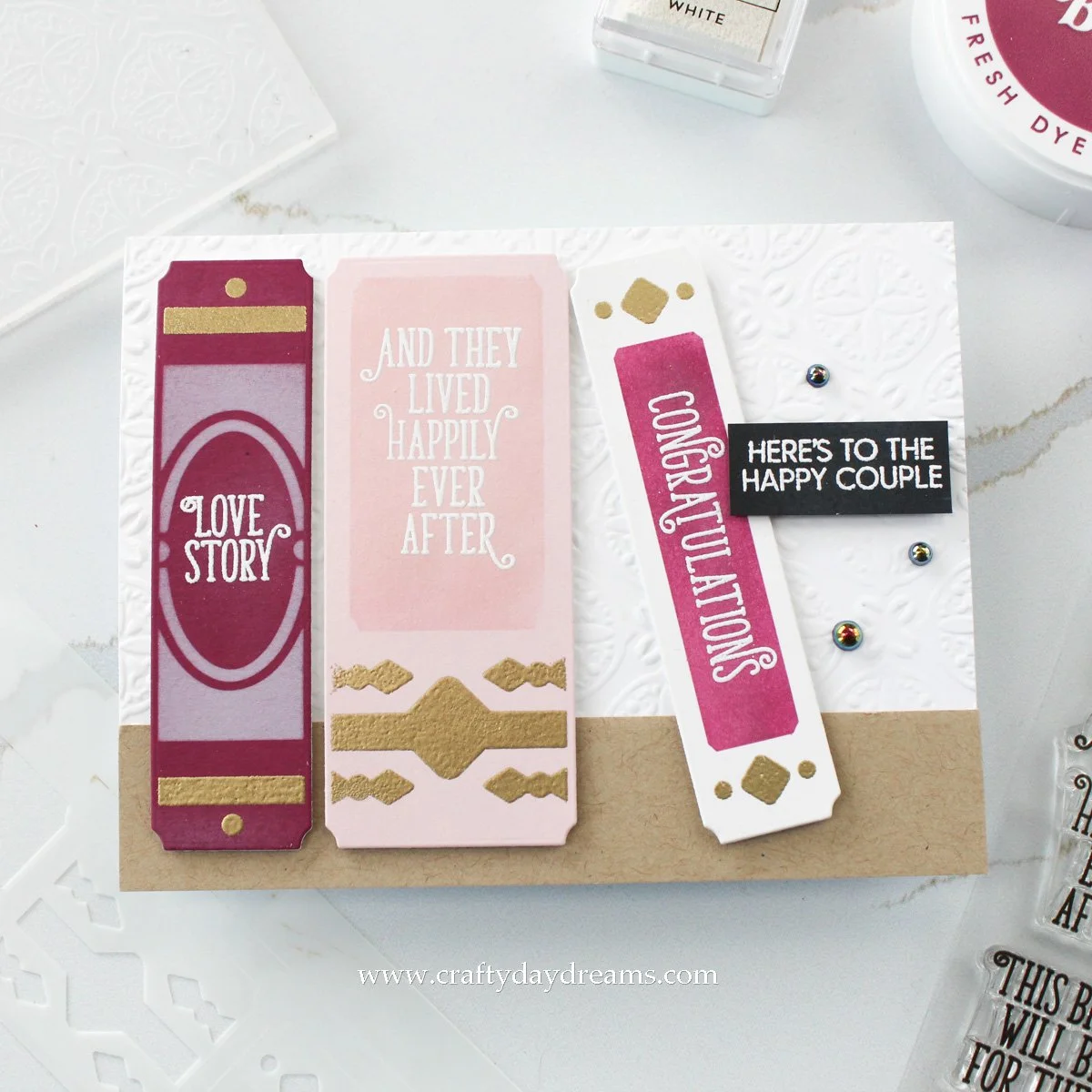 When I got to creating this card, I knew I would be making a shelf/table out of kraft cardstock, so I cut a strip of Wheat cardstock to 1-inch by 5.5-inches. I was honestly a little stuck with what colors I wanted to play with, but having recently created a vampy card, I decided to lean that way with my color palette and die cut books out of Hero Arts Plum, Ballet Slipper, and Ivory cardstocks. To the Plum book, I used white pigment ink to blend on the large spine detail, then used Ballet Slipper ink on the Ballet Slipper book, and Cosmic Berry fresh dye ink on the Ivory book. Once that ink blending dried back, I used a foam dome blending tool and applied Versamark ink to the small details (I guess what would usually be foiled on books) on the stencil, then added Gilded embossing powder to try to mimic gold foiling. Once the books had cooled, I set up a jig using a scrap die cut of the Simple Shelves die and popped the books on my grip mat in my mini MISTI. I lined up the ‘Love Story’, ‘And they lived happily ever after’, and the ‘Congratulations’ sentiments on each book, then white heat embossed them.